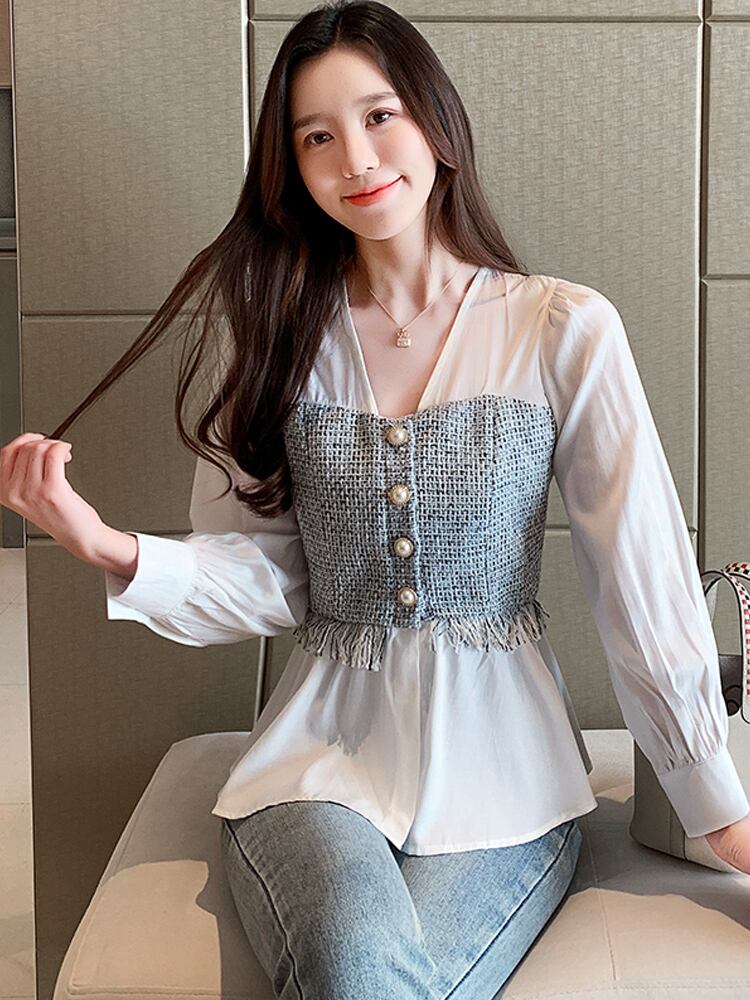 【送料無料】シャツ ブラウス 白 切り替え ツイード ロング おしゃれ 個性的 長袖 春 秋 トップス レディース フリル パール Vネック モテる 大人可愛い 清楚 きれいめ 上品 スタイリッシュ S M L 大きいサイズ XL 2XL ホワイト 白 コーデ 春 秋 冬 カワイイ ラブリー ガーリー レトロ おしゃれ デート お出かけ 存在感 こなれ感 抜け感 普段 デイリー 主役級 インスタ映え 韓国 シャツ ファッション 海外トレンド 大人気 10代 20代 30代 40代 プチプラ db2896