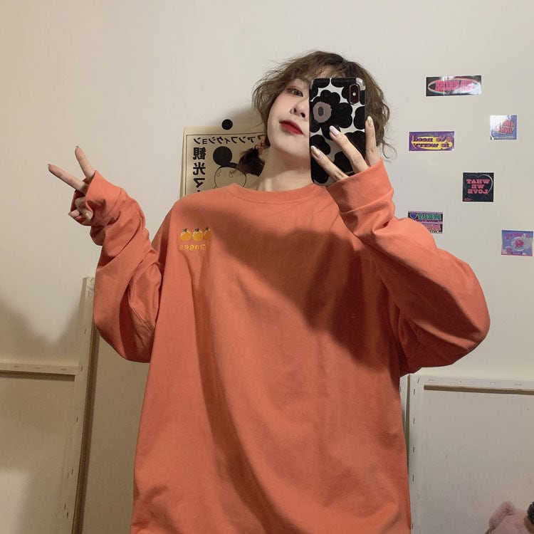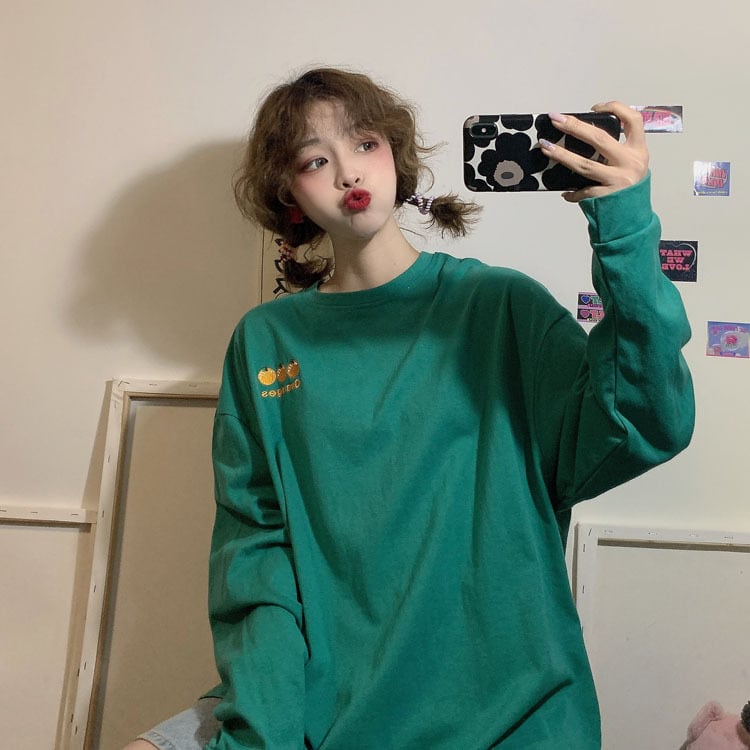 【送料無料】 6色 ロンT トップス Tシャツ レディース 長袖 おしゃれ プルオーバー ワンポイント みかん カジュアル 可愛い 大きめ ゆったり こなれ感 コーデ 通勤 通学 学生 白 黒 青 緑 橙 グレー ホワイト ブラック ブルー グリーン オレンジ 10代 20代 春 秋 冬 トレンド インスタ映え 韓国 ファッション お揃い 普段着 着回し 双子 ママ ママコーデ 女子会 デート 公園 お洒落 存在感 主役級 大人カジュアル ゆる オーバーサイズ 大人可愛い db2818