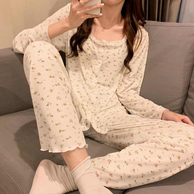 【送料無料】 3種類 ルームウェア パジャマ 上下セット パンツ かわいい ガーリー 小花 さくらんぼ チェリー もも ピーチ 白 長袖 薄手 春 夏 秋 レディース 部屋着 寝巻き ナイトウェア ラブリー ラウンドネック レース 前開き メロー加工 大人可愛い おしゃれ レトロ キュート 柄 春 夏 秋 冬 10代 20代 30代 ママ OL 学生 女子会 お泊まり 休日 旅行 楽ちん モテ M L XL 2XL 大きいサイズ ゆったり ゆる 女の子 韓国 ファッション db2777