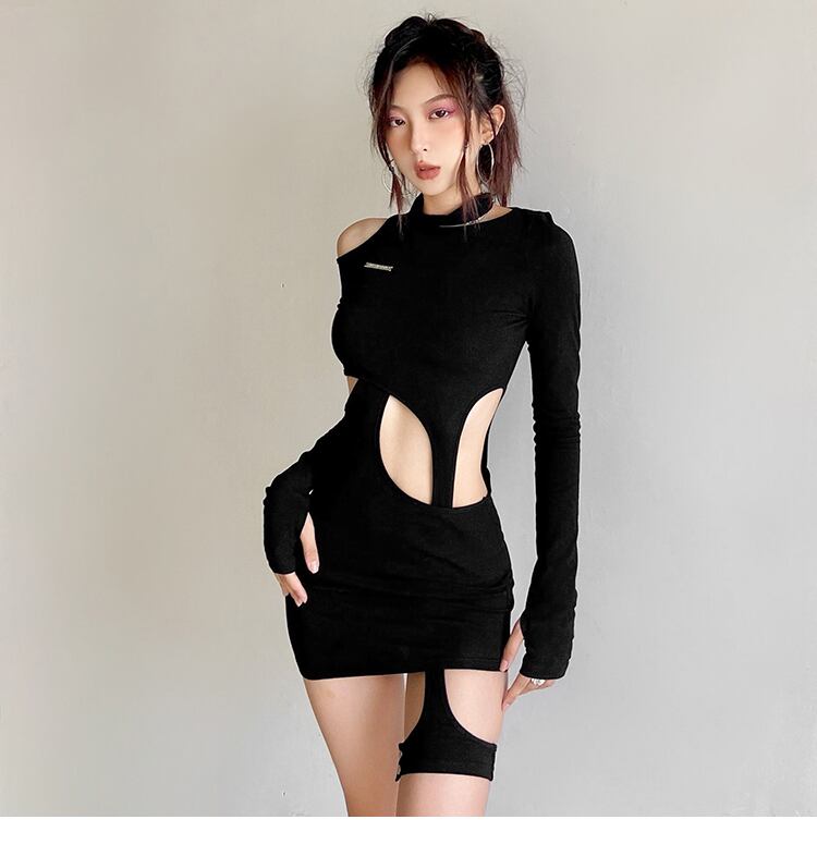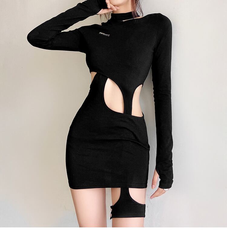 【送料無料】 ワンピース セクシー タイト ミニ ドレス 黒 無地 長袖 萌袖 指穴 かっこいい 個性的 チョーカー ガーター ガーターリング ロゴ カットワーク 肌見せ キャバドレス 超ミニ アシンメトリー ストリート イベント 衣装 春 秋 10代 20代 レディース お出かけ パーティー モテ 穴あき プチプラ トレンド 流行 インスタ映え S M L クール モード系 主役級 ゴージャス キャバ嬢 ラウンジ クラブ ブラックコーデ 韓国 ファッション ワンピドレス db2784