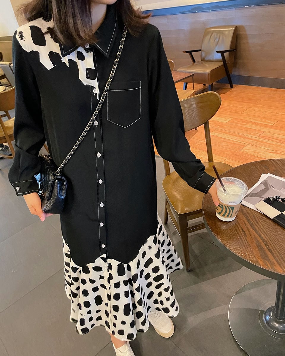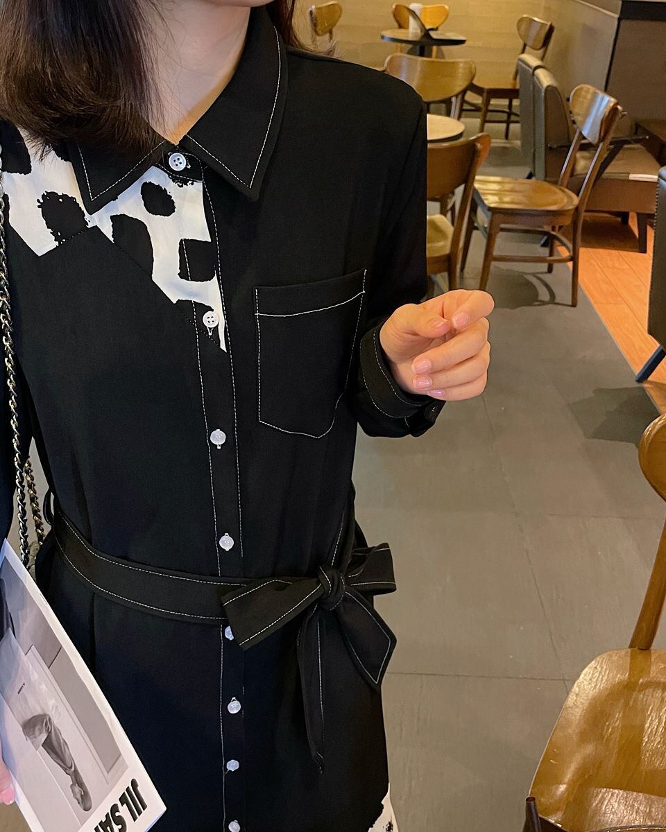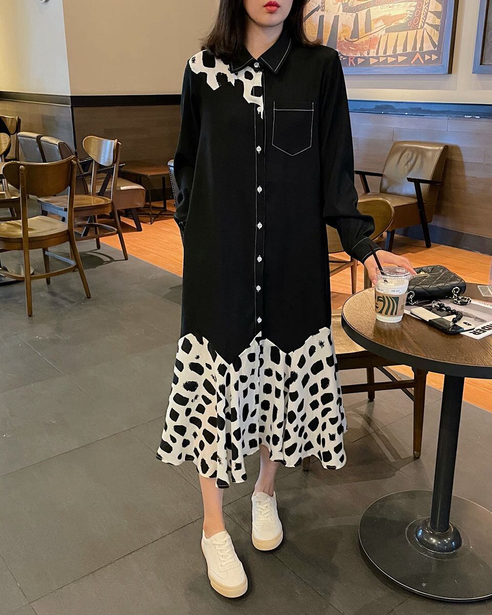 【送料無料】 シャツ ワンピース レディース ロング丈 ミモレ 水玉 ドット 牛柄 ウシ 長袖 切り替え 個性的 ワンピ ドレス カジュアル 襟付き 切替 大人可愛い かっこいい 黒 ブラック レトロ 大人可愛い おしゃれ カ大きいサイズ M L XL 2XL 3XL こなれ感 インスタ映え 春 秋 冬 10代 20代 30代 通勤 学生 休日 お出かけ お揃い 双子 韓国 ママ スタイル ファッション コーデ デート トレンド 主役級 存在感 スタイル 個性的 db2847