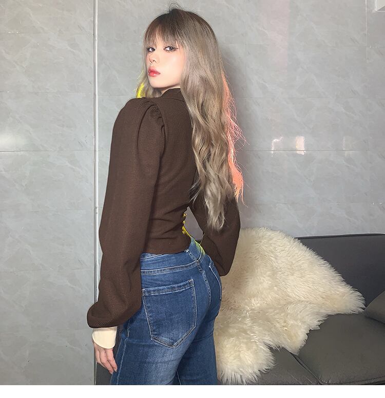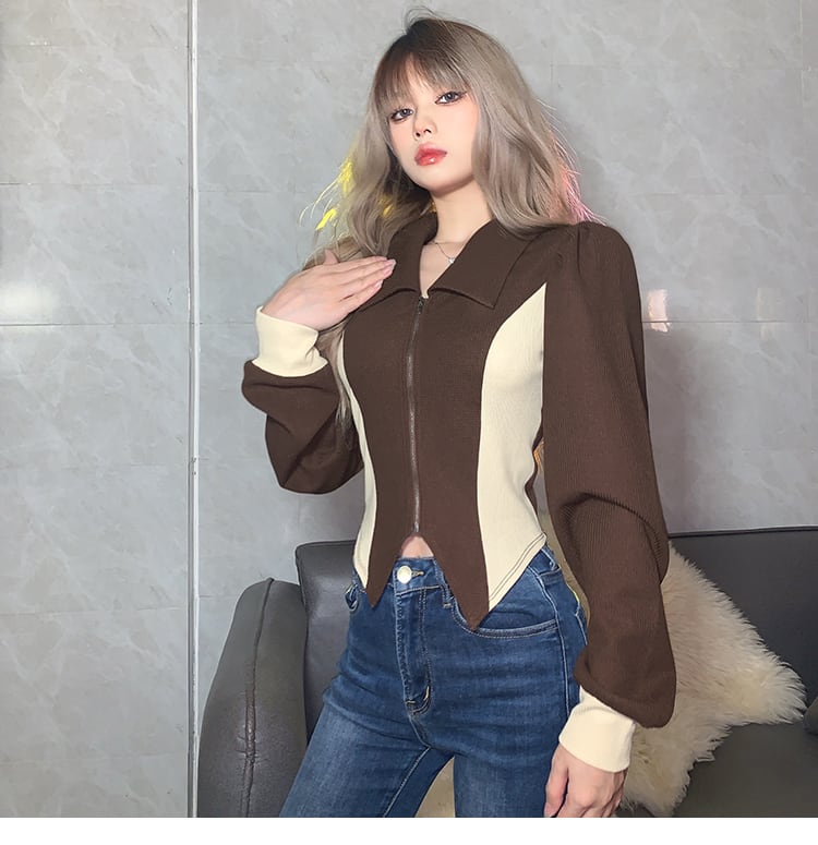 【送料無料】 2色 ジャケット カーデ 黒 茶色 バイカラー フロントジップ ワッフル生地 長袖 春 秋 薄手 アウター トップス タイト 細身 ヘムライン Vネック パワーショルダー 袖あり 襟付き かわいい 大人可愛い カジュアル レトロ クール セクシー 主役級 存在感 抜け感 無地 春 秋 10代 20代 レディース OL 通勤 学生 デート お出かけ 着回し 普段使い 重ね着 モテ 体系カバー 新作 プチプラ トレンド 流行 インスタ映え S M L 配色 db2797