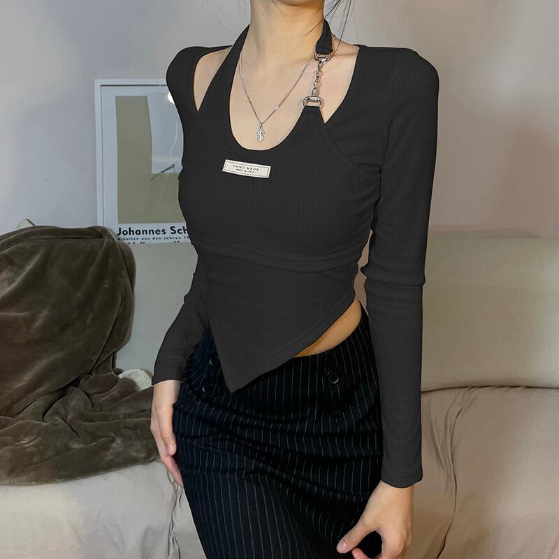 【送料無料】 3色 カットソー 長袖 トップス 薄手 タイト レイヤード風 かっこいい 春 秋 肌見せ ニット風 ロンT グレー ブラック ハンキングネック リブ チェーン 胸元 ロゴ Vカット ヘムライン 襟なし ホルターネック風 無地 春 夏 秋 10代 20代 30代 レディース 重ね着 モテ 新作 プチプラ トレンド 流行 インスタ映え S M L XL 2XL 大きいサイズ 大人可愛い きれいめ カジュアル クール 韓国 ファッション ダンス クラブ 細身 スリム プルオーバー db2800