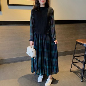 【送料無料】 ワンピース レディース ロング丈 ニット 無地 チェック プリーツ 長袖 襟なし ラウンドネック 切替 フェイクツーピース 大人可愛い かっこいい 黒 緑 ブラック グリーン レトロ 大人可愛い おしゃれ カジュアル 大きいサイズ S M L XL 2XL 3XL 4XL こなれ感 インスタ映え 春 秋 冬 10代 20代 30代 通勤 学生 休日 お出かけ 韓国 ママ スタイル ファッション コーデ デート 人気 大人カジュアル クール トレンド 主役級 スタイル 個性的 db2851