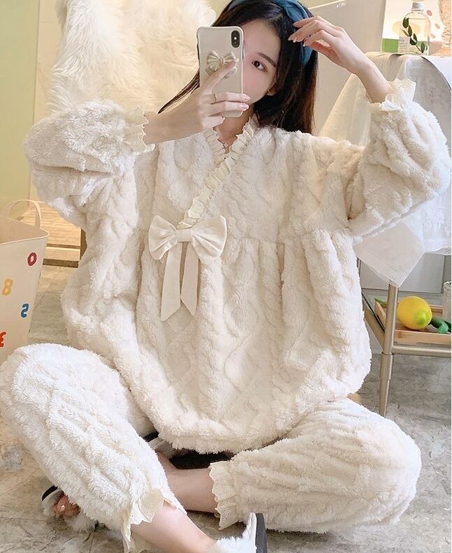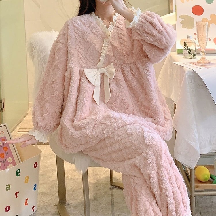 【送料無料】 2色 もこもこ ルームウェア 上下セット パジャマ 秋 冬 かわいい アプリコット ピンク パンツ プルオーバー 部屋着 寝巻き ナイトウェア 長袖 Vネック カシュクール レース リボン モコモコ ふわふわ 大人可愛い お洒落 ラブリー キュート ガーリー 10代 20代 レディース 女子会 お泊まり 休日 リラックス 普段使い お揃い 楽ちん 暖かい 防寒 モテ プレゼント ギフト プチプラ トレンド 流行 インスタ映え 海外 M L XL 2XL 大きいサイズ ゆったり db2773