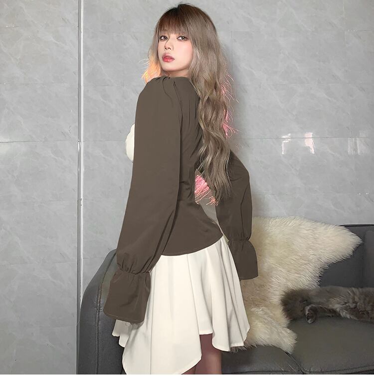 【送料無料】2色 セットアップ フレア ワンピース レディース 長袖 シャツ トップス コルセット風 ショート丈 バイカラー 黒 白 くすみカラー かわいい レトロ ガーリー 個性的 ミニ キャバドレス ボディコン 膝上 肩見せ ハイウエスト フリル Aライン キャミワンピ ワンピドレス ガーター風 ブラウス お得 セット 大人可愛い きれいめ おしゃれ レトロ キャバクラ XS S M L XL 2XL 大きい 小さい 春 秋 10代 20代 パーティー クラブ 韓国 ファッション db2976