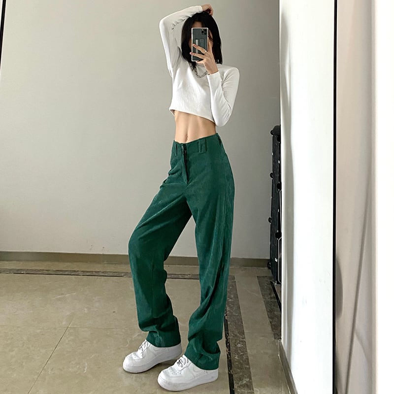【送料無料】パンツ ズボン レディース コーデュロイ ノータック ボトムス ハイウエスト 緑 グリーン 無地 個性的 目立つ タック ルーズ ストレート ゆったり カジュアル 秋 冬 こなれ感 ラフ ストリート キレイめ 単色 ジーパン ジーンズ 女の子 ズボン ボトムス ロールアップ お洒落 冬 ウィンター 秋 オータム デート お出かけ インスタグラマー インスタ映え 韓国ファッション 海外トレンド トレンディ 大人気 高見え プチプラ 10代 20代 30代 db3008