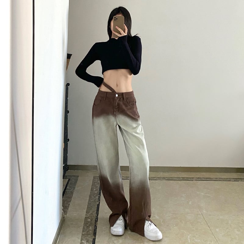 【送料無料】3色 パンツ デニム レディース ズボン ロング丈 フレア スリット 青 緑 茶色 グラデーション 個性的 ジーパン ジーンズ ストラップ付 フレア バイカラー ヴィンテージ加工 エイジング加工 カッコイイ セクシー ハイウエスト クール 春 秋 ズボン ボトムス タイト レトロ レディース 美脚 脚長 オシャレ 存在感 こなれ感 抜け感 主役級 インスタ映え 韓国ファッション 女の子 gパン 海外トレンド 大人気 高見え 流行 人気 10代 20代 30代 40代 プチプラ db3009