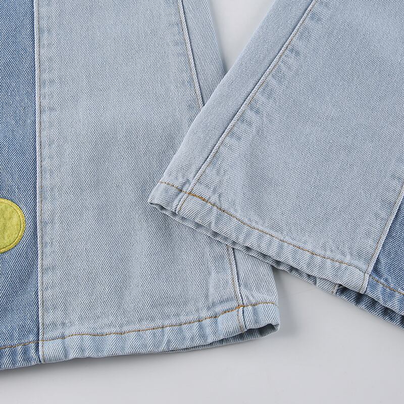 二色のブルーを切り替えてカラフルな花柄刺繍をあしらったデニムパンツです。