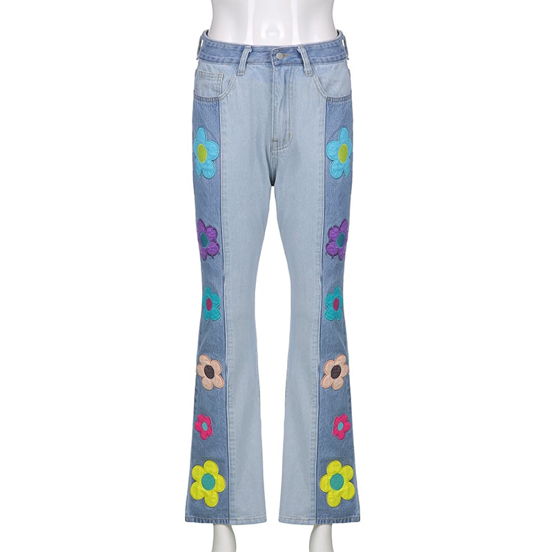 【送料無料】 パンツ デニム レディース ズボン 花柄 バイカラー レトロ かわいい 個性的 ジーパン ジーンズ ロング丈 フレア 切り替え カラフル リメイク風 フラワー ウォッシュ加工 ボタニカル カッコイイ セクシー ハイウエスト クール 春 夏 秋 ズボン ボトムス gパン アンクル丈 ブーツカット ブルーデニム 淡色 水色 美脚 脚長 存在感 こなれ感 抜け感 主役級 インスタ映え 韓国ファッション 海外トレンド 大人気 ユニーク 女の子 面白い 10代 20代 30代 40代 db3014