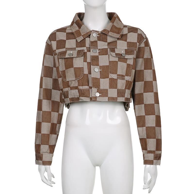 【送料無料】 デニム ジャケット ミニ丈 レディース クロップ丈 ショート丈 ブロックチェック 市松模様 長袖 Gジャン ジャンパー 襟付き ヴィンテージ風 レトロ かわいい 個性的 春 秋 薄手 アウター 上着 大人可愛い シンプル カジュアル かっこいい ストリート セクシー 女の子 甘辛MIX クール 主役級 存在感 10代 20代 30代 ギャル クラブ イベント 衣装 茶色 ブラウン お出かけ 着回し 普段使い 重ね着 モテ 新作 プチプラ トレンド 流行 インスタ映え 海外 db3023