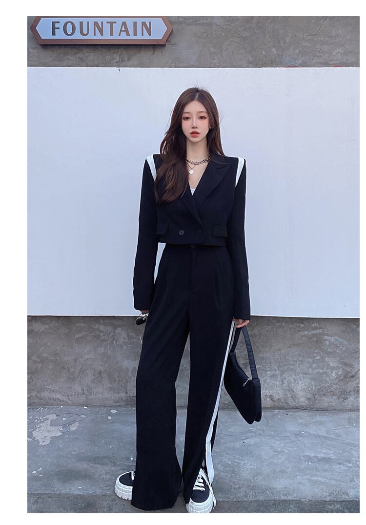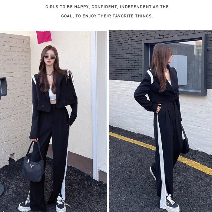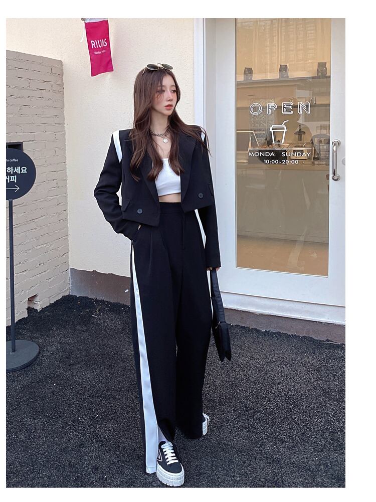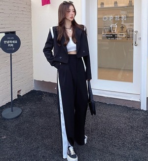 【送料無料】 セットアップ パンツ スーツ カッコイイ ジャケット 黒 ブラック モノトーン ショート丈 トップス 上下セット 長袖 ハイウエスト バイカラー 個性的 ダンス 衣装 ズボン ウエストゴム ライン 脚長 スタイルアップ 裾スリット かっこいい クール S M L XL 襟付き ストレート ワイド イベント 衣装 カジュアル お洒落 エレガント 無地 春 夏 秋 冬 10代 20代 30代 レディース オフィス ビジネス OL 通勤 普段 トレンド インスタ映え 流行 海外 db3040