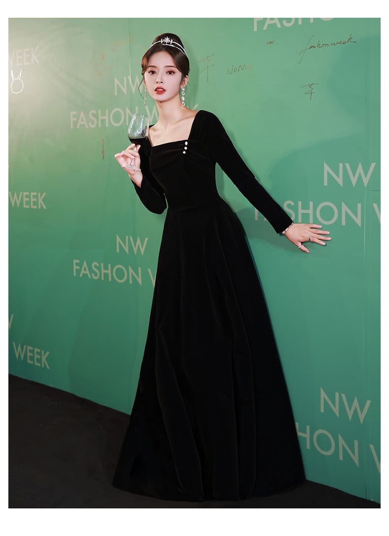 【送料無料】ロング ドレス パーティードレス 個性的 黒 袖あり 結婚式 二次会 お呼ばれ フォーマル 演奏会 ピアノ 発表会 ドレス 大人 かっこいい パール スクエアネック ベルベット 可愛い デコルテ 長袖 Aライン シック 2XS XS S M L XL 2XL 大きいサイズ パフスリーブ スレンダー 主役級 存在感 お姫様 プリンセス フェミニン お呼ばれ パーティー イベント 舞台 モデル 撮影 衣装 海外 韓国 dress イブニング ブラックドレス カラードレス ロング丈 no2234