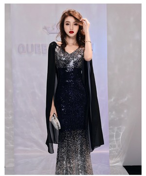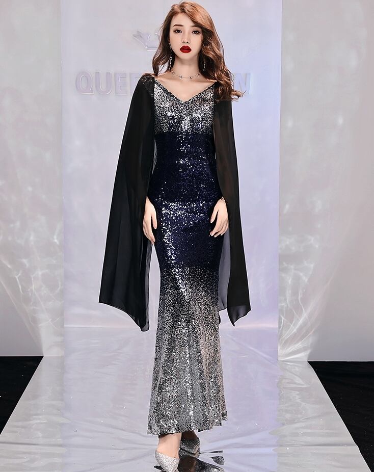 【送料無料】2色 ロング ドレス パーティードレス 個性的 カッコイイ マーメイド マント風 黒 銀 袖あり 結婚式 二次会 お呼ばれ フォーマル 演奏会 ピアノ 発表会 ドレス 大人 かっこいい 可愛い メタリック Vネック フレアスリーブ ケープ風 タイト スリム グラデーション Vネック バイカラー XS S M L XL 2XL 3XL 大きいサイズ お呼ばれ パーティー イベント 舞台 モデル 撮影 衣装 海外 韓国 dress イブニングドレス カラードレス ロング丈 no2246