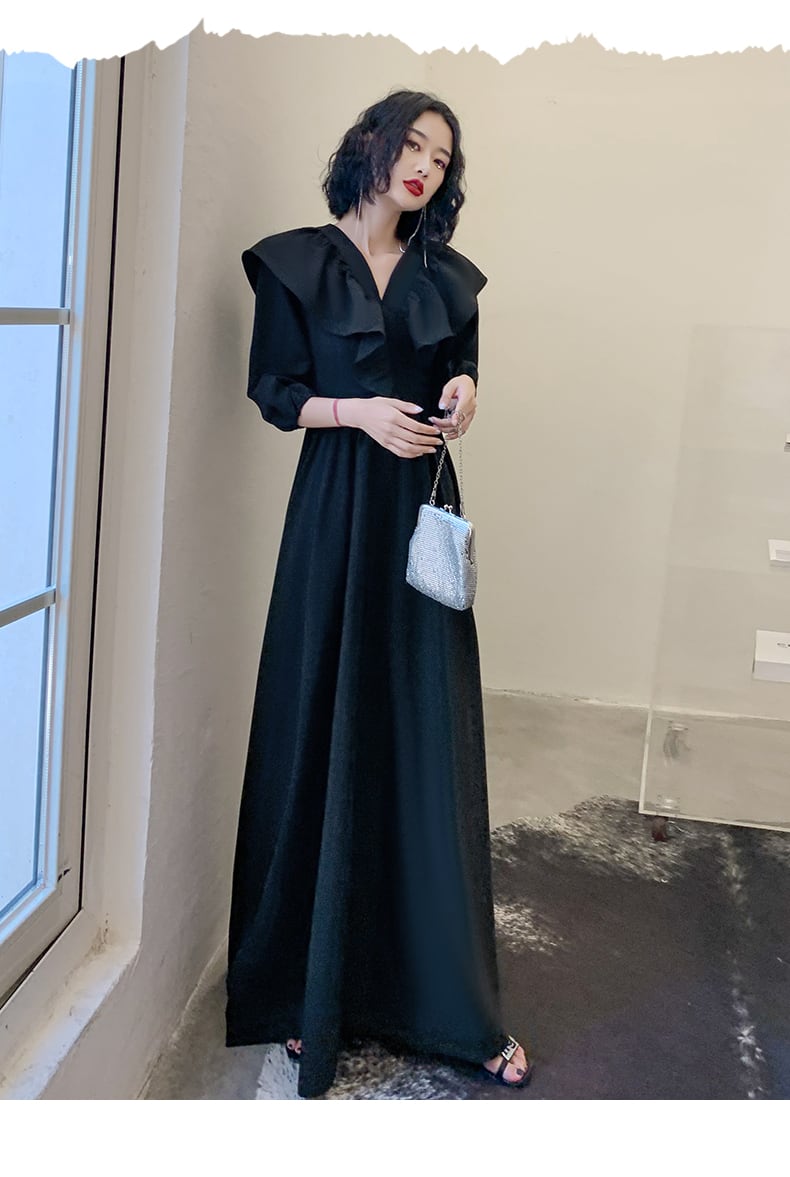 【送料無料】ロング ドレス パーティードレス 個性的 袖あり 黒 無地 大人可愛い ビッグカラー Aライン 結婚式 二次会 お呼ばれ フォーマル 演奏会 ピアノ 発表会 ドレス ワンピース 大人 かっこいい 長袖 フリル Vネック シンプル レディース 上品 ブラック エレガント 謝恩会 20代 30代 40代 50代 XS S M L XL 2XL 3XL 大きいサイズ 同窓会 パーティー イベント 舞台 モデル 撮影 衣装 海外 韓国 dress ロング丈 イブニングドレス no2258