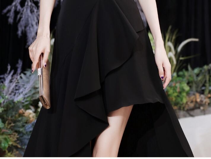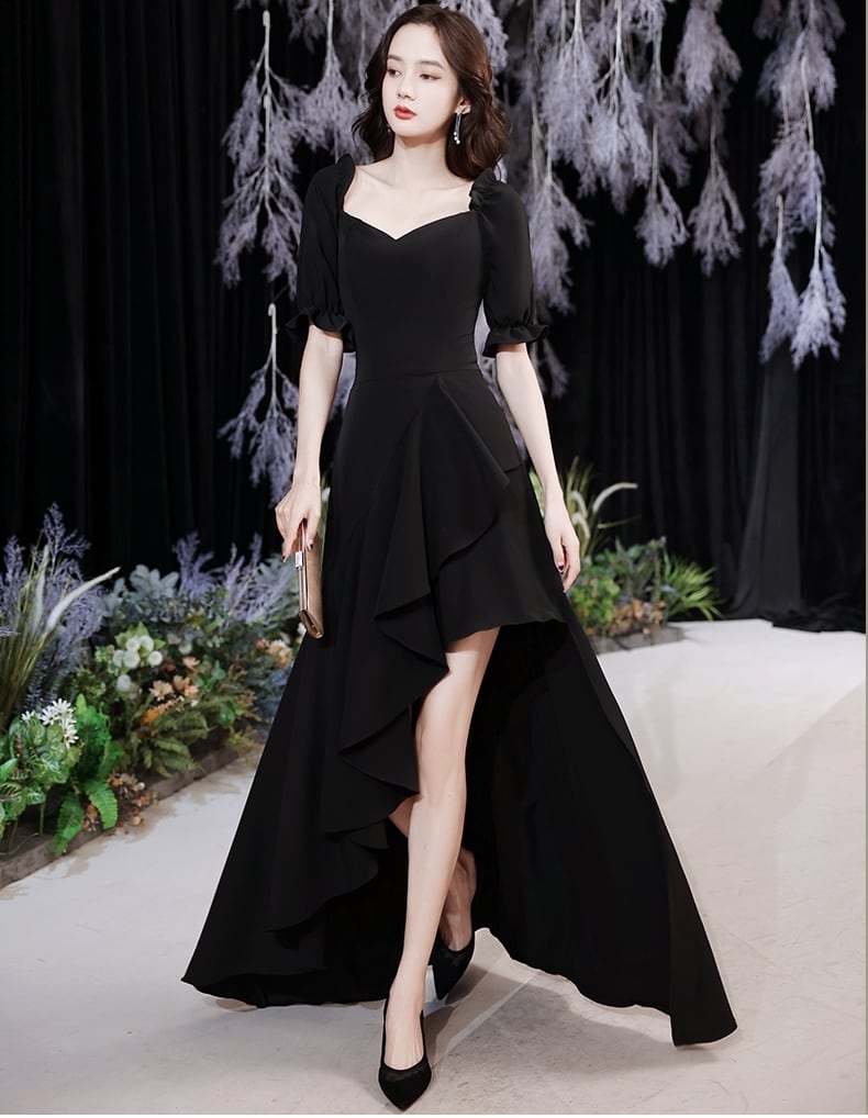 【送料無料】ロング ドレス パーティードレス フィッシュテール 個性的 黒 無地 袖あり アシンメトリー カッコイイ 結婚式 二次会 お呼ばれ フォーマル 演奏会 ピアノ 発表会 ドレス 大人 かっこいい 可愛い フリル ラップスカート風 レイヤード 半袖 ウエストマーク ハートシェイプドネック セクシー スリット風 膝丈 足見せ XS S M L XL 2XL 3XL大きいサイズ お呼ばれ パーティー キャバ嬢 撮影 衣装 海外 韓国 dress イブニング ブラックドレス ロング丈 no2261