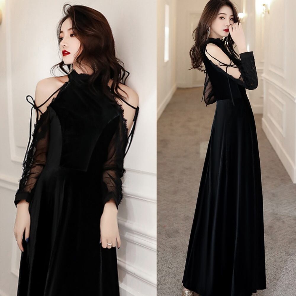 【送料無料】ロング ドレス パーティードレス オフショル 袖あり 黒 個性的 大人可愛い セクシー 結婚式 二次会 お呼ばれ フォーマル 演奏会 ピアノ 発表会 ドレス 大人 かっこいい 可愛い プリンセス Aライン ホルターネック レース リボン ゴージャス 上品 肩出し 長袖 エレガント 透け感 シースルー 春 夏 シフォン フレア XS S M L XL 2XL 大きいサイズ ブラックドレス お呼ばれ パーティー イベント 舞台 衣装 海外 韓国 dress ロング丈 イブニング no2271
