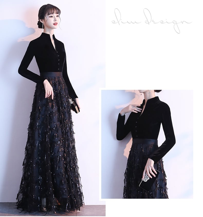【送料無料】ロング ドレス パーティードレス カッコイイ 長袖 シック 個性的 黒 スタンドカラー 結婚式 二次会 お呼ばれ フォーマル 演奏会 ピアノ 発表会 ドレス ワンピース 大人 かっこいい 可愛い 秋 冬 袖あり ドッキング ハイウエスト 切り替え レディース スパンコール エレガント 華やか ブラックドレス Aライン フレア 20代 30代 40代 50代 XS S M L XL 2XL 大きいサイズ お呼ばれ パーティー 撮影 衣装 海外 韓国 dress ロング丈 no2296