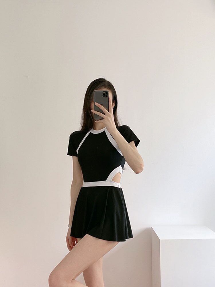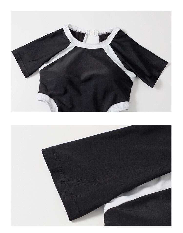 【送料無料】ワンピース 水着 レディース スポーティー 袖あり 黒 無地 カッコイイ フィットネス ミニスカート 体型カバー 水着 ママ お腹カバー 二の腕カバー 半袖 日焼け防止 可愛い キュート バイカラー チラ見せ おしゃれ 個性的 女性用 水着 ワンピ オールインワン ブラックコーデ 背中 プール 温泉 M L XL 2XL 大きいサイズ シンプル 無地 10代 20代 30代 40代 50代 ヨガ 運動 スポーツ スイムウェア 韓国系 オルちゃん 動きやすい ラフ こなれ感 db2633