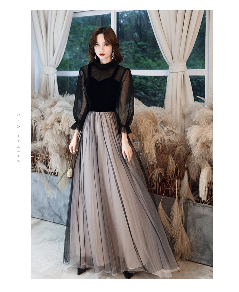 【送料無料】ロング ドレス パーティードレス 大人可愛い 個性的 黒 バイカラー 長袖 ドット柄 チュール 透け感 ニュアンスカラー 切り替え 結婚式 二次会 お呼ばれ フォーマル 演奏会 ピアノ 発表会 ドレス ワンピース 大人 かっこいい Aライン プリンセス 大人カラー シック クール レトロ モダン 袖あり ハイネック カッコイイ ブラックドレス 10代 20代 30代 40代 50代 XS S M L XL 2XL 3XL 大きいサイズ お呼ばれ 海外 韓国 dress ロング丈 no2314