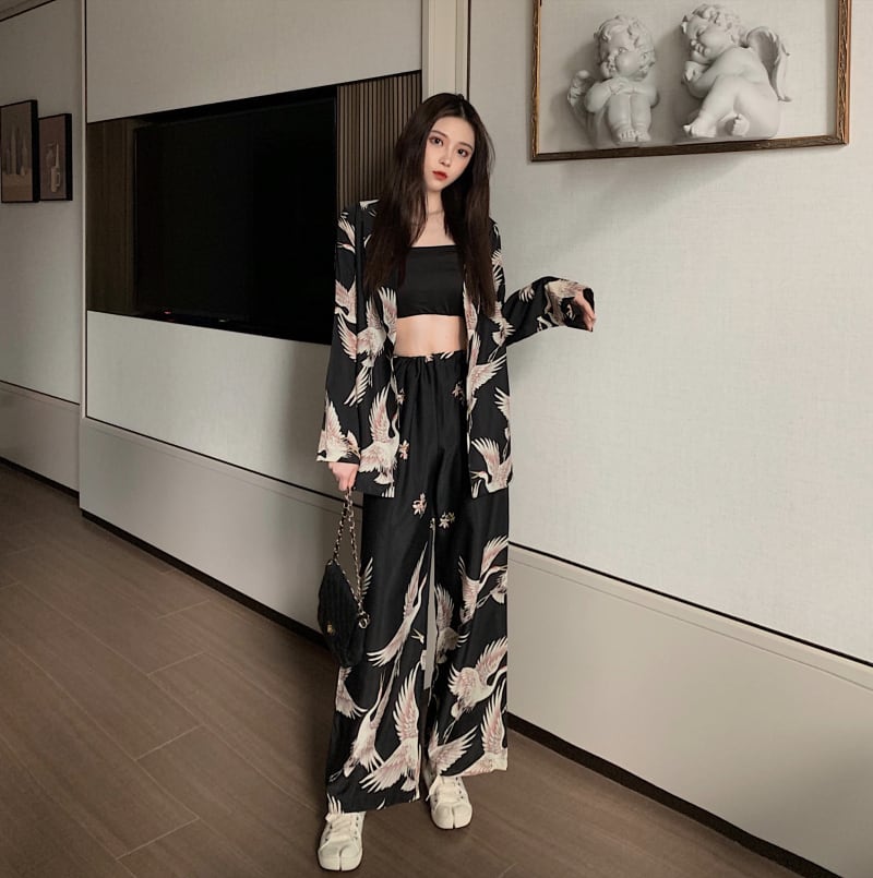 斬新な鶴柄が目を引くモダンレトロなセットアップ
