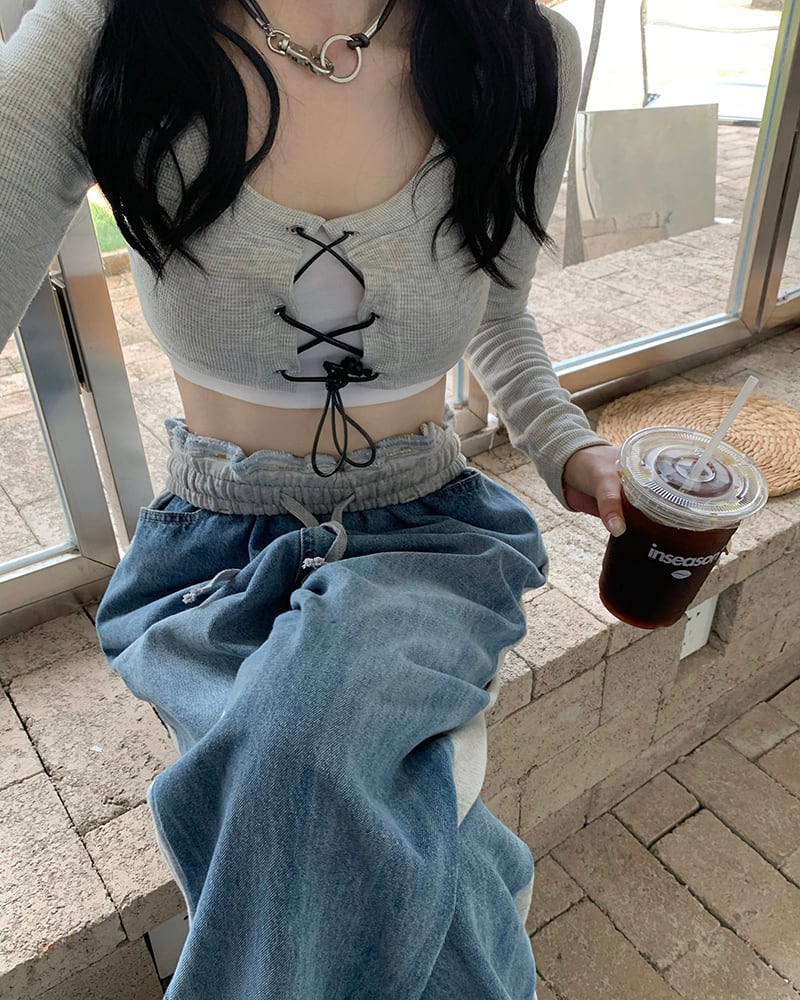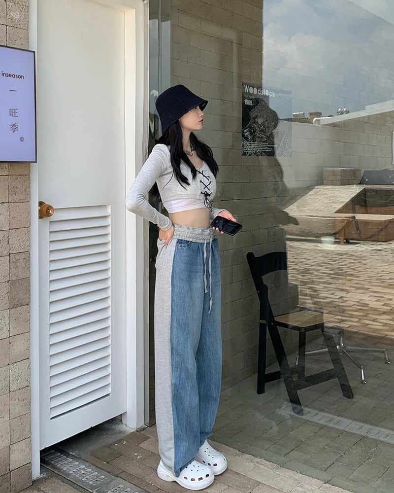 デニムとスウェット生地の切り替えが個性的で存在感抜群なパンツです。