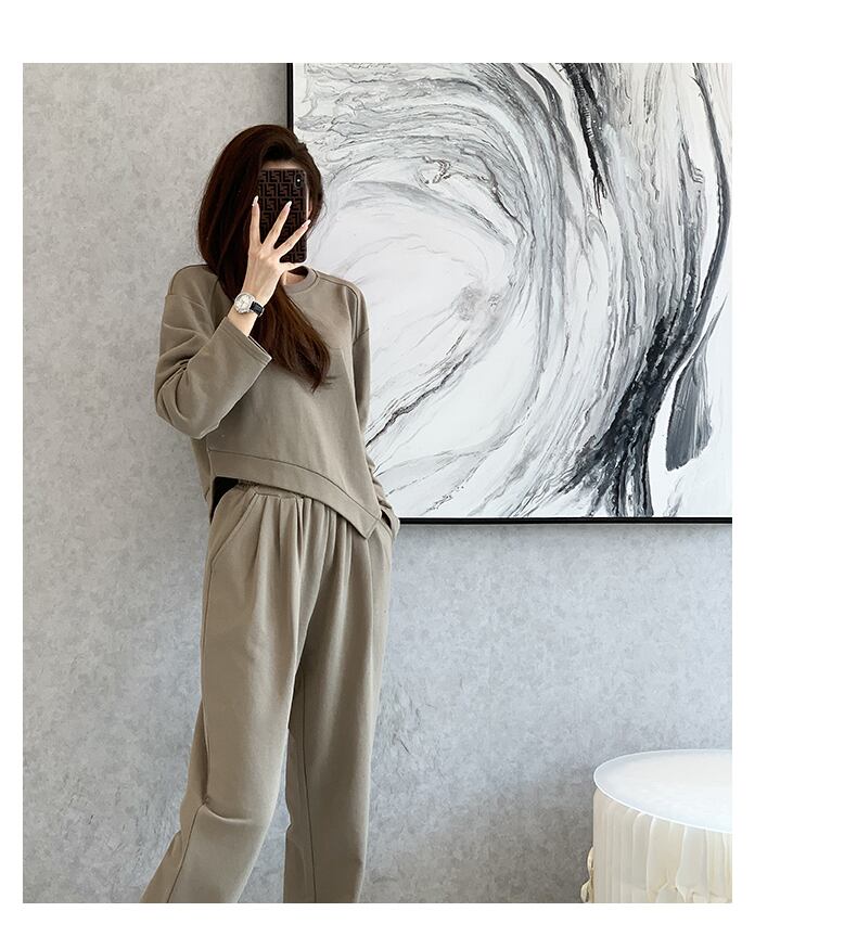 【送料無料】2色 セットアップ スウェット パンツ ジャージ 上下セット カーキ ブラック クルーネック アシンメトリー プルオーバー ドロップショルダー スポーツウエア スポーティー パーカー ズボン カッコイイ 個性的 カジュアル ラフ 長袖 大人可愛い シンプル おしゃれ レトロ 春 秋 冬 10代 20代 30代 レディース ゆったり 休日 運動 ジム ヨガ アウトドア 着回し 普段使い 楽ちん モテ トレンド 流行 海外 db3228