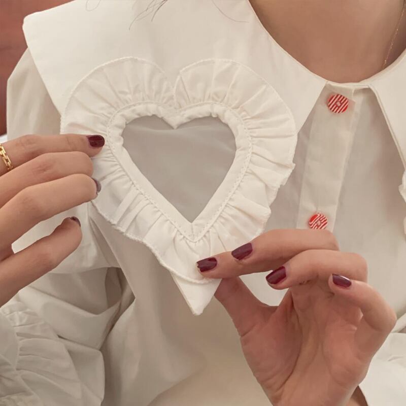 【送料無料】ハート柄 ブラウス シャツ 白 フリル 無地 ビッグカラー シンプル 長袖 春 トップス 夏 襟付き ボリューム袖 着回し ガーリー ラブリー キュート かわいい 個性的 おしゃれ レディース ホワイト S M 大きいサイズ L XL 春 秋 冬 デート 大人可愛い お出かけ カジュアル 目立つ ユニーク ハート こなれ感 抜け感 女子会 普段使い デイリー使い 休日 主役級 インスタ映え 韓国ファッション 海外トレンド 白シャツ 面白い 10代 20代 30代 40代 プチプラ db3105