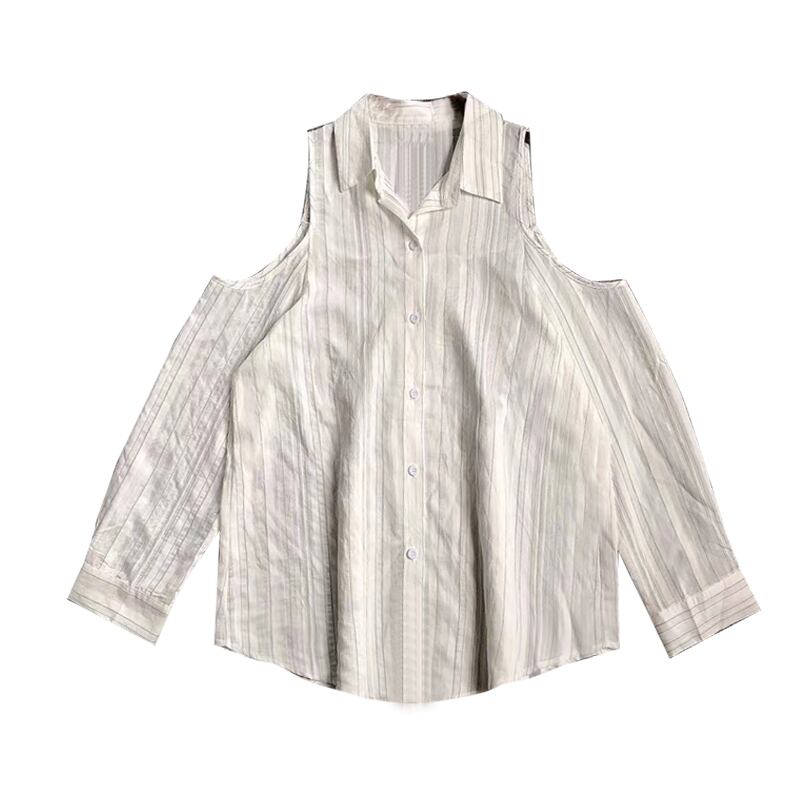【送料無料】2色 肩出し シャツ ブラウス ストライプ 襟付き セクシー 可愛い 個性的 長袖 春 トップス 夏 白 青 キュート きれいめ モテる レディース ブルー ホワイト S M 大きいサイズ L XL ロング丈 シャツ ボーダー 透け感 カジュアル コーデ 秋 冬 おしゃれ デート 大人可愛い お出かけ 存在感 こなれ感 抜け感 インスタ映え 韓国ファッション 海外 ギャル 抜け感 カッコイイ 白トップス 10代 20代 30代 プチプラ db3109
