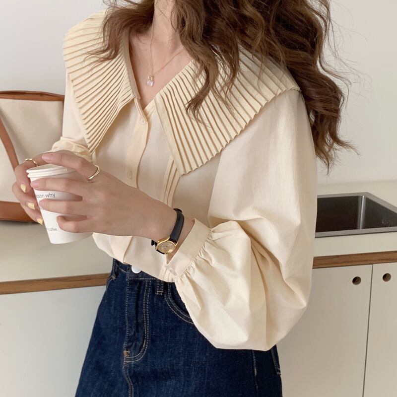 【送料無料】2色 ブラウス シャツ 無地 プリーツ ビッグカラー 襟付き ボリューム袖 着回し ガーリー キュート きれいめ 可愛い ラフ 長袖 トップス 個性的 スタイリッシュ モテる ガーリー レディース ブルー アプリコット 青 ワンサイズ フリーサイズ 春 秋 冬 おしゃれ デート 大人可愛い お出かけ 存在感 こなれ感 抜け感 女子会 普段使い デイリー使い 休日 主役級 インスタ映え 韓国ファッション 海外トレンド 大人気 高見え 流行 10代 20代 30代 プチプラ db3110