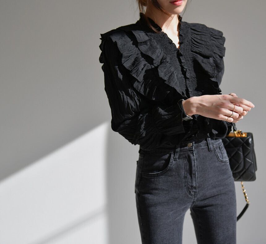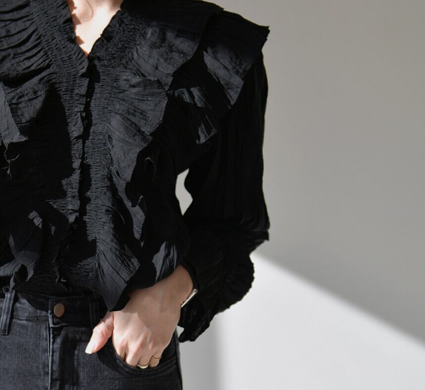 【送料無料】2色 くしゅくしゅ ブラウス シャツ フリル シフォン インパクト 無地 長袖 個性的 トップス 春 秋 かっこいい クール Vネック 可愛い スタイリッシュ モテる 袖あり 黒 シャツ レディース シワ加工 クシュクシュ フリーサイズ ワンサイズ ブラック アプリコット 黒 春 秋 冬 おしゃれ デート 大人可愛い お出かけ こなれ感 抜け感 女子会 インスタ映え 韓国ファッション 海外 ユニーク OL 通勤 ビジネス トップス 10代 20代 30代 安い db3123