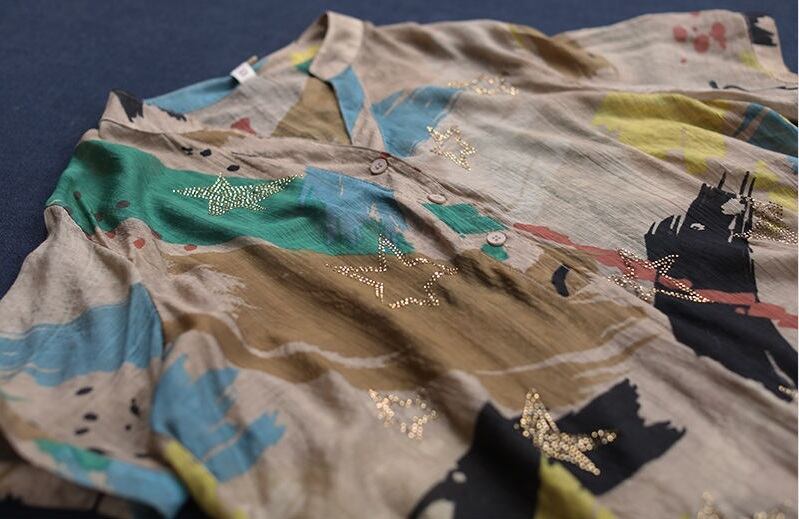 【送料無料】春 夏 ブラウス シャツ レトロ プリント ペイント風 コットンリネン 個性的 トップス 半袖 インパクト モード系 ラフ ゆったり 着回し カッコイイ カジュアル グラフィティ スタイリッシュ ユニーク 袖あり リラックス レディース ブラウン 茶色 M 大きいサイズ L XL 2XL 3XL 春 夏 お出かけ 存在感 こなれ感 抜け感 韓国ファッション 海外 旅行 ユニーク シャツ 楽ちん トップス カラフル 10代 20代 30代 40代 db3131