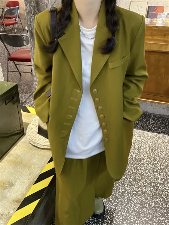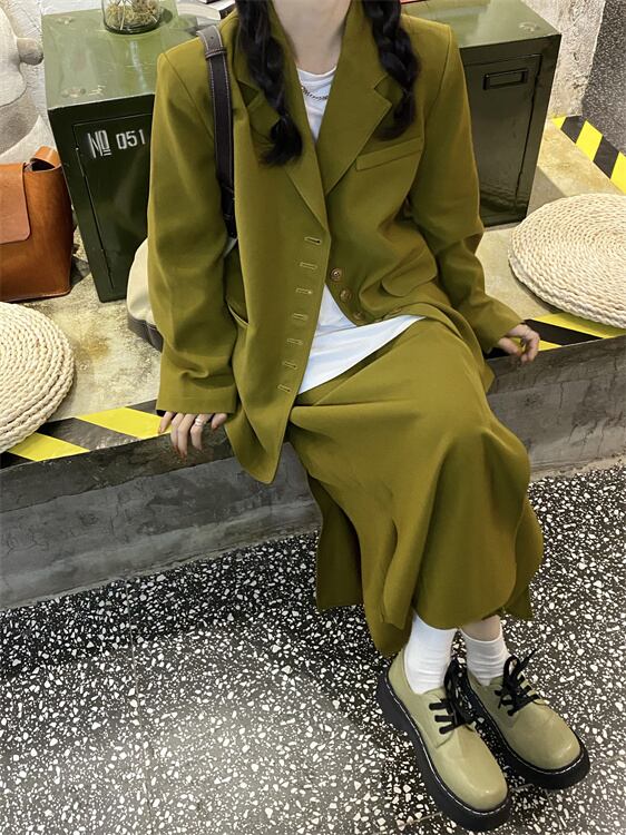 【送料無料】セットアップ ジャケット ロングスカート 上下セット ツーピース レトロ 長袖 個性的 カッコいい 緑 グリーン スーツ レディース フォーマル カジュアル スリット シック ロング丈 上着 アウター スリット スカート シンプル 無地 カーキ 深緑 クール カッコイイ 華やか 大人可愛い S M L カワイイ 春 秋 冬 お出かけ 存在感 主役級 こなれ感 インスタ映え 韓国ファッション 海外 パーティー 結婚式 二次会 お呼ばれ ユニーク 目立つ 10代 20代 30代 db3148