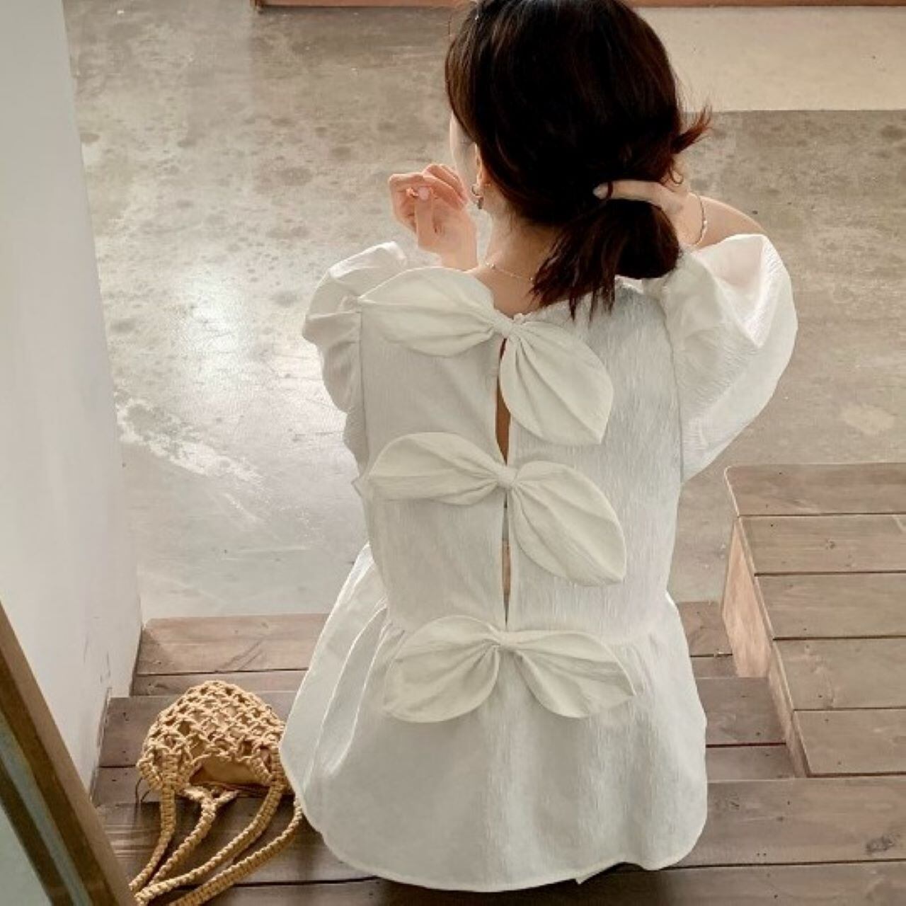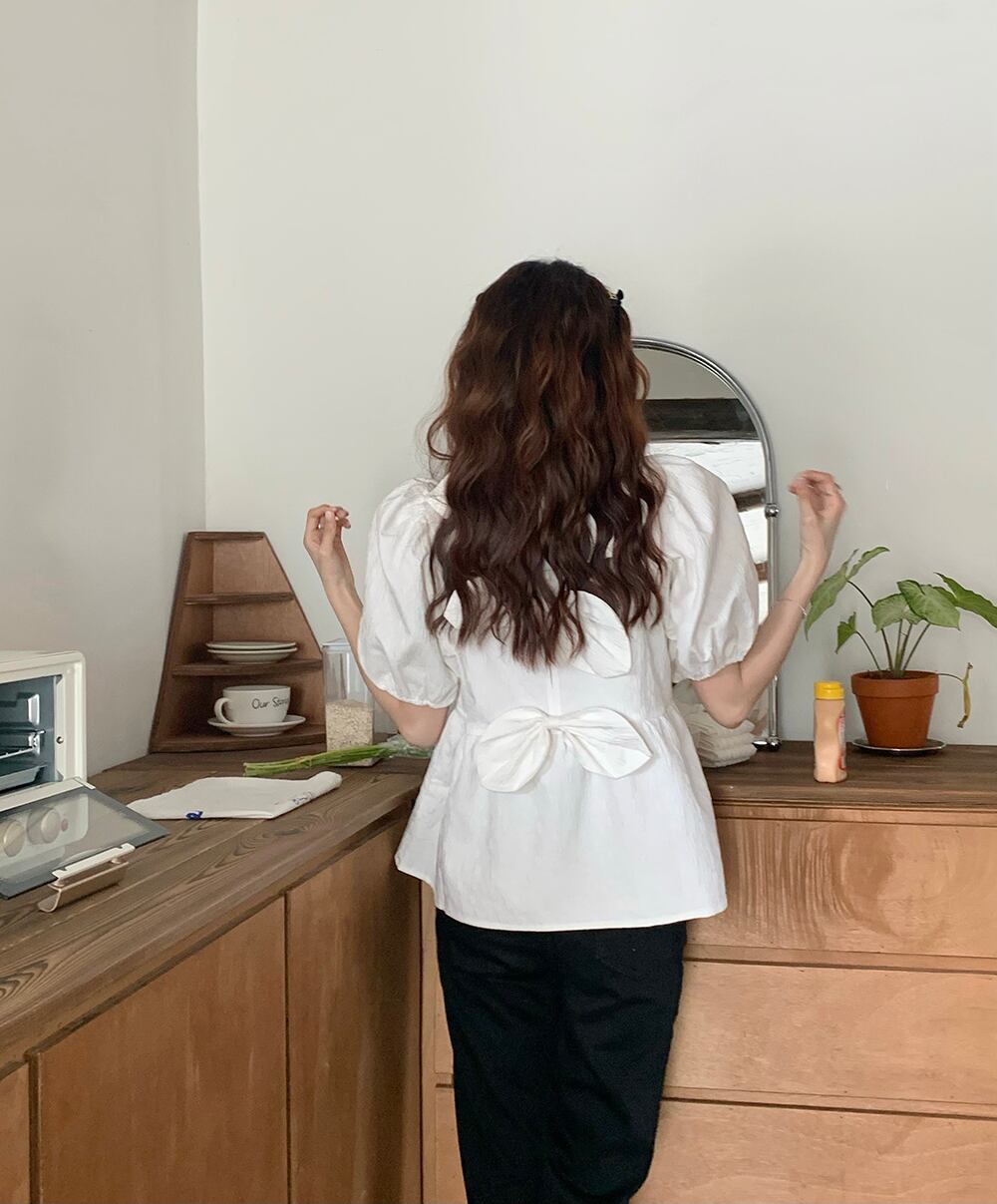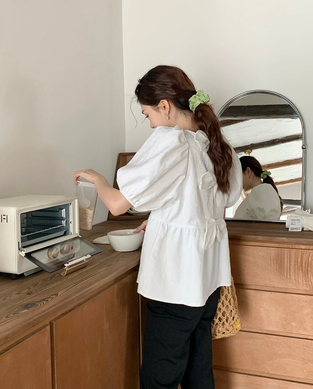 【送料無料】2色 ブラウス シャツ バッグリボン 半袖 花柄 パフスリーブ 白 無地 かわいい 春 夏 トップス シンプル ガーリー 上品 きれいめ ヘビロテ お姉さん 着回し 可愛い スタイリッシュ モテる ロングシャツ モテブラウス レディース グリーン ホワイト 緑 白 ワンサイズ フリーサイズ 春 夏 スプリング サマー おしゃれ デート 大人可愛い お出かけ 存在感 こなれ感 抜け感 インスタ映え 韓国ファッション 海外 白トップス 10代 20代 30代 プチプラ db3155