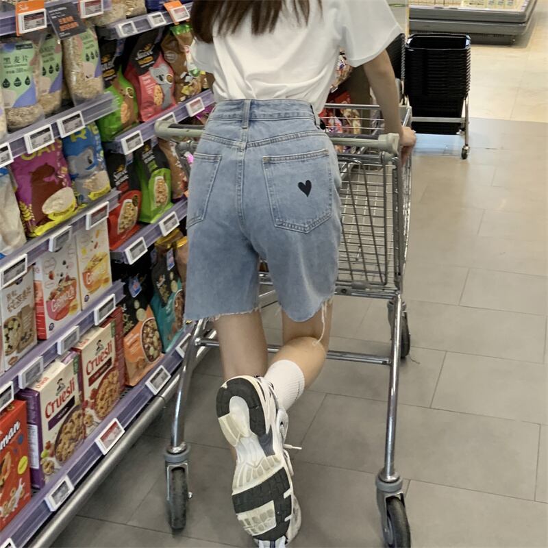 【送料無料】2色 デニム ハーフパンツ ジーンズ 切りっぱなし ハイウエスト ショートパンツ ハート マーク バックシャン gパン ズボン カッコイイ ラフ クール 春 夏 カジュアル コーデ レディース S M 大きいサイズ L ライトブルー 淡色 ブルーデニム ネイビー 水色 紺 大人カワイイ インスタ映え 韓国ファッション 海外 ボーイッシュ マニッシュ 健康的 元気 ボトムス ミニ丈 ボタン ルーズ 面白い バックコンシャス ポイント10代 20代 30代 安い 通学 学校 db3157