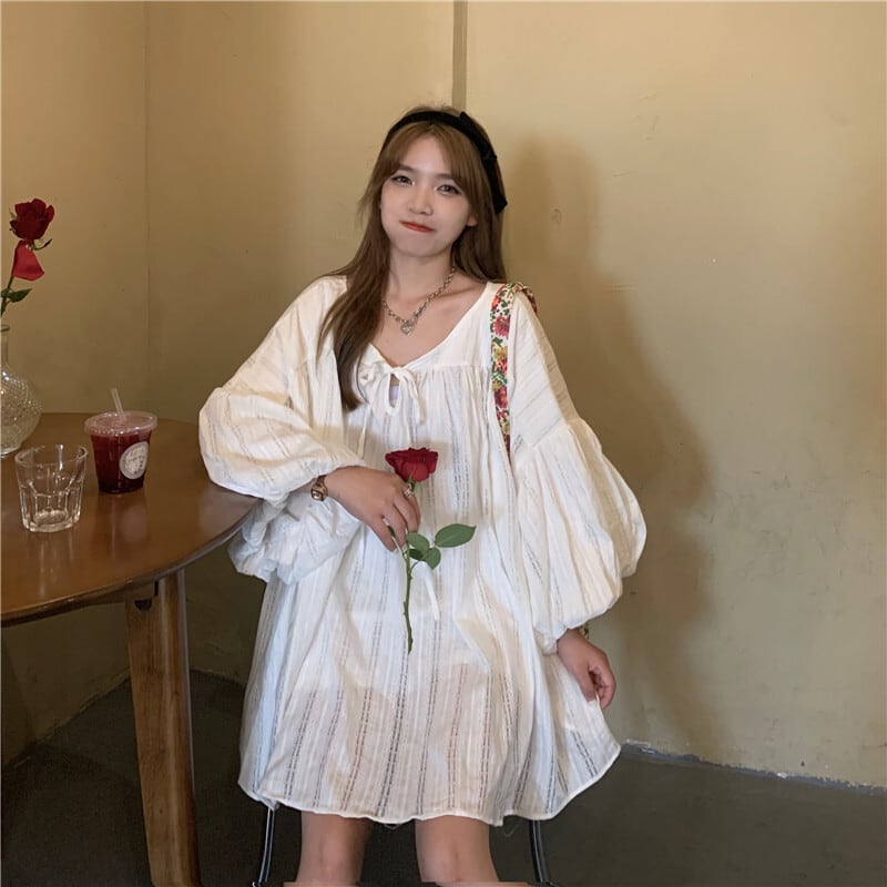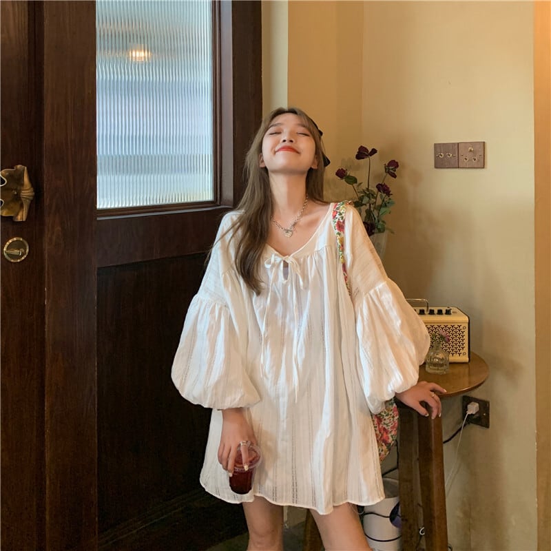 ボリューム袖と大きめVネックがレトロで可愛いシャツワンピースです。