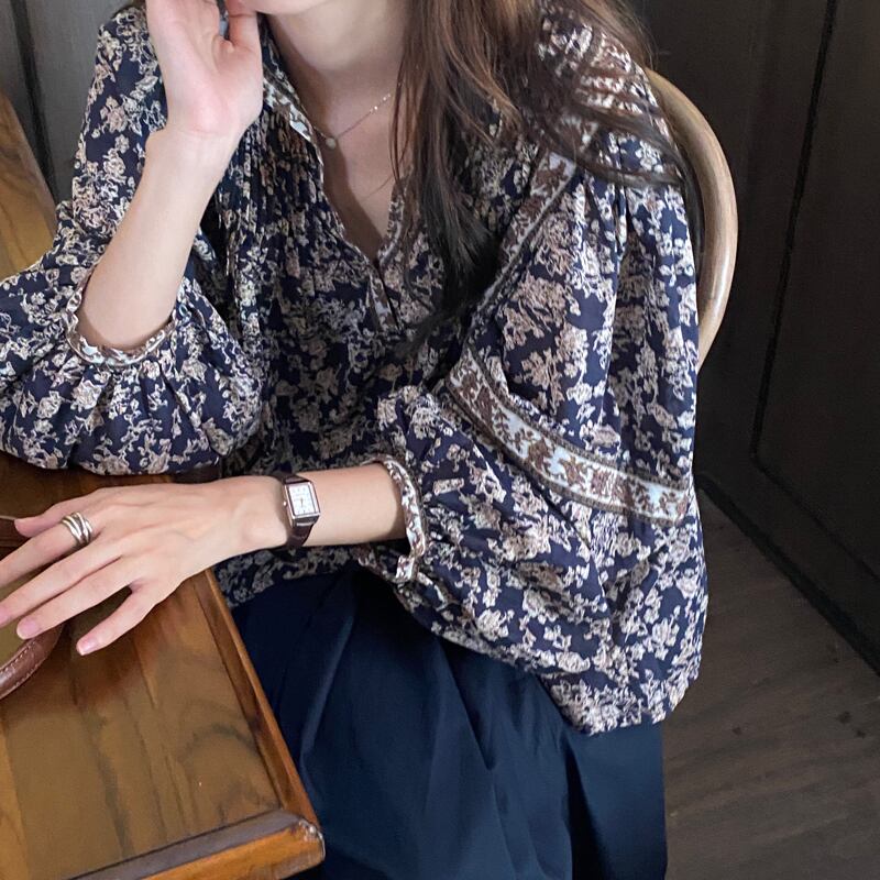 深みのある配色と花柄がヴィンテージ風の高級感あふれるブラウスです。