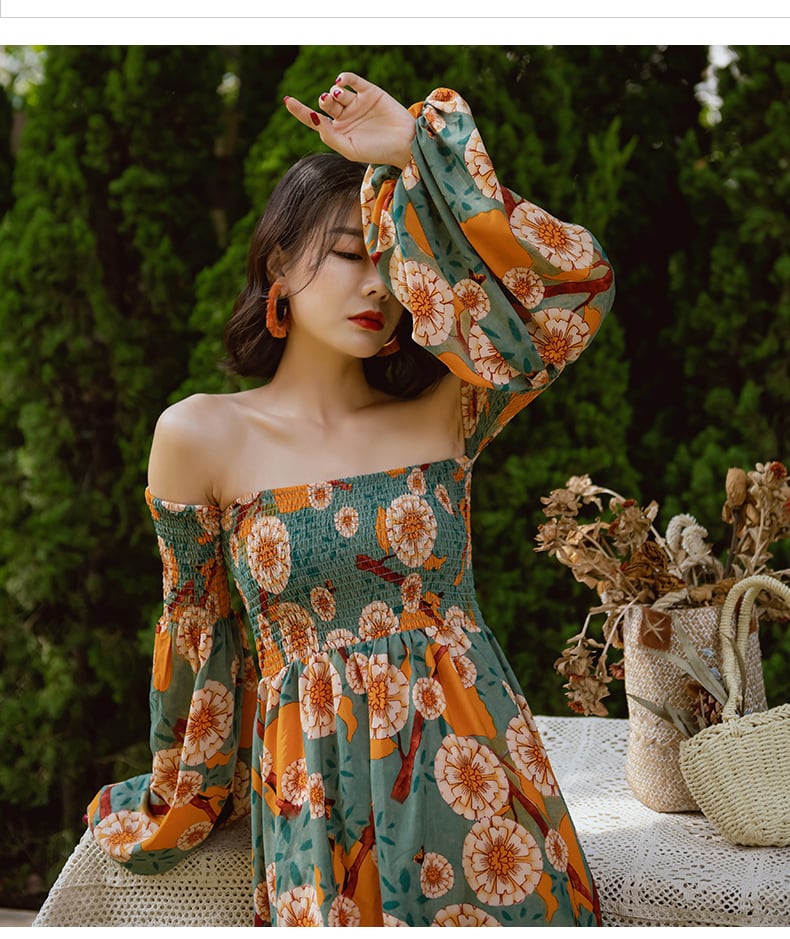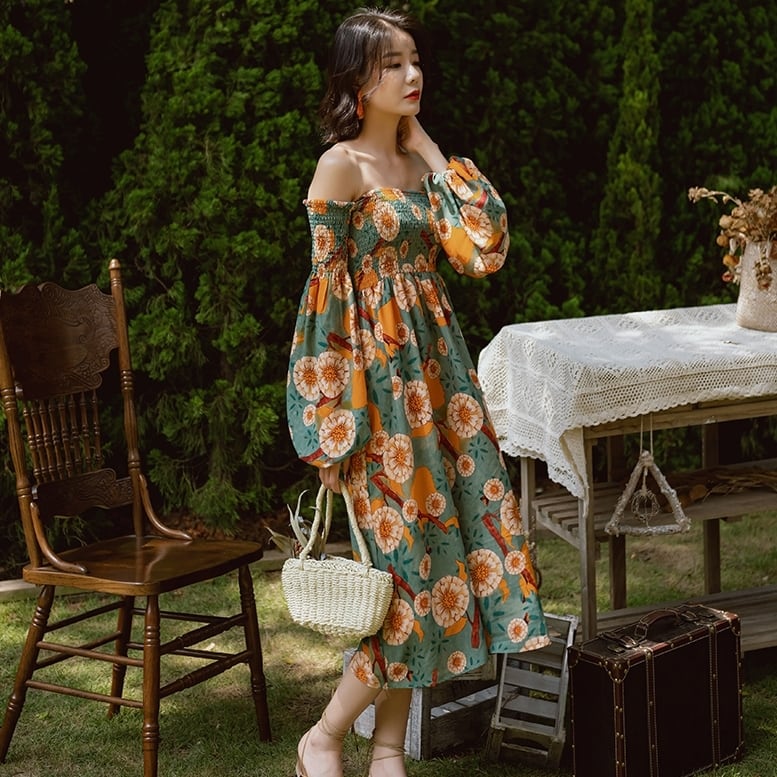 【送料無料】ミモレ丈 ワンピース ドレス オフショルダー シャーリング 花柄 長袖 フラワー フローラル バイカラー レトロ モダン 和風 ロング フレア ワンピ 春 夏 ワンピース レディース ガーリー 緑 グリーン くすみカラー 黄色 Aライン おしゃれ 総柄 お呼ばれ パーティードレス デート リゾート きれいめ モテコーデ オリエンタル セクシー かわいい いい女 華やか インスタ映え 海外 10代 20代 30代 韓国系 二次会 存在感 衣装 イベント dress こなれ感 db3299