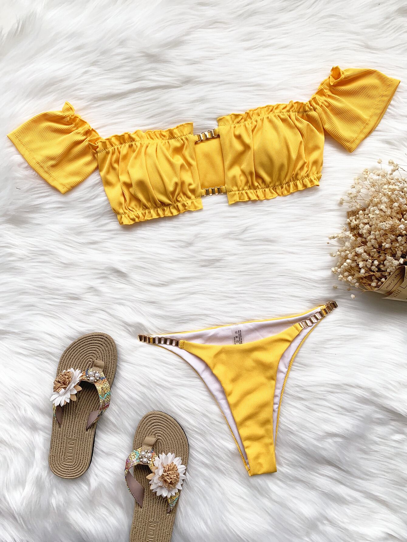 【送料無料】ビキニ 水着 Tバック オフショル 上下セット 大人可愛い セクシー ハイレグ 袖あり セパレート 水着 胸元 谷間 フリル 個性的 海外 バンドゥ ビキニ かっこいい ゴールド バックル アクセ 露出 半袖 レトロ キュート スタイルアップ モテ レディース ピンク イエロー ホワイトブラック 桃色 黄色 白 黒 S M 大きいサイズ L XL 夏 サマー リゾート バカンス 海 プール スイムウェア おしゃれ インスタ映え グラビア 水着 衣装 イベント 10代 20代 db3361