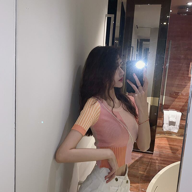 【送料無料】2色 ニット 半袖 トップス ショート丈 へそ出し リブ バイカラー プルオーバー マルチカラー 切り替え タイト ニット カジュアル ポップ ガーリー 韓国 モテ ファッション ギャル 着回し 可愛い レディース ピンク ブルー 桃色 青 春 夏 トップス 袖あり ミニ丈 おしゃれ デート 大人可愛い お出かけ 存在感 こなれ感 抜け感 普段使い デイリー使い 休日 主役級 インスタ映え 海外 ニュアンス パステルカラー 10代 20代 30代 プチプラ db3373