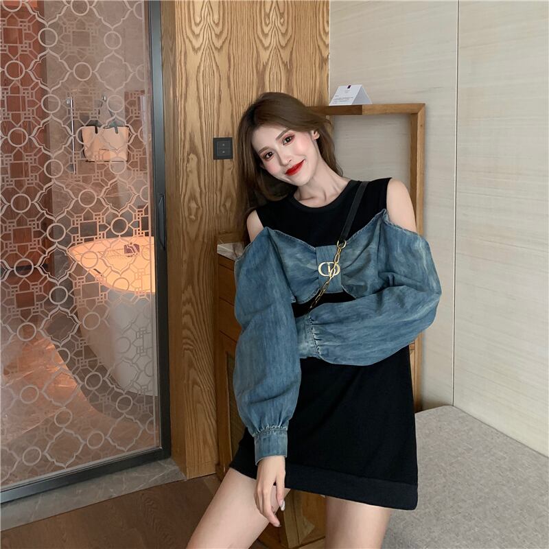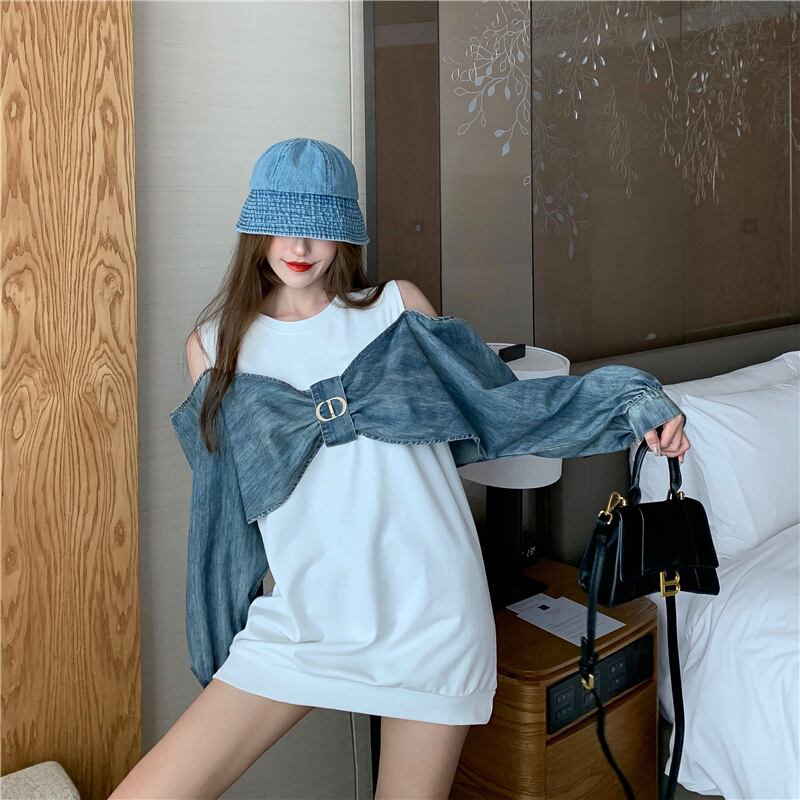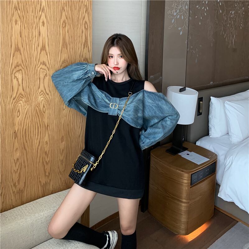 【送料無料】2色 ミニワンピース 長袖 トップス プルオーバー 個性的 デニム 切り替え バイカラー リボン風 肩出し 肌見せ オフショル トレーナーワンピ ポップ スポーティ アクティブ カジュアル レトロ 可愛い レディース ホワイト 白 黒 ブラック 春 夏 秋 韓国 ファッション ブルーデニム ドッキングワンピース 楽ちん おしゃれ デート 存在感 こなれ感 抜け感 ユニーク 面白い 海外 コーデ 映える ワンピ 10代 20代 30代 プチプラ db3378