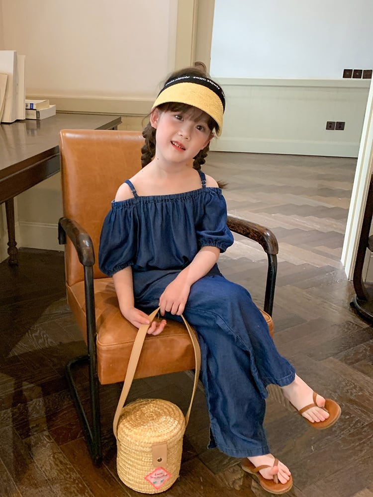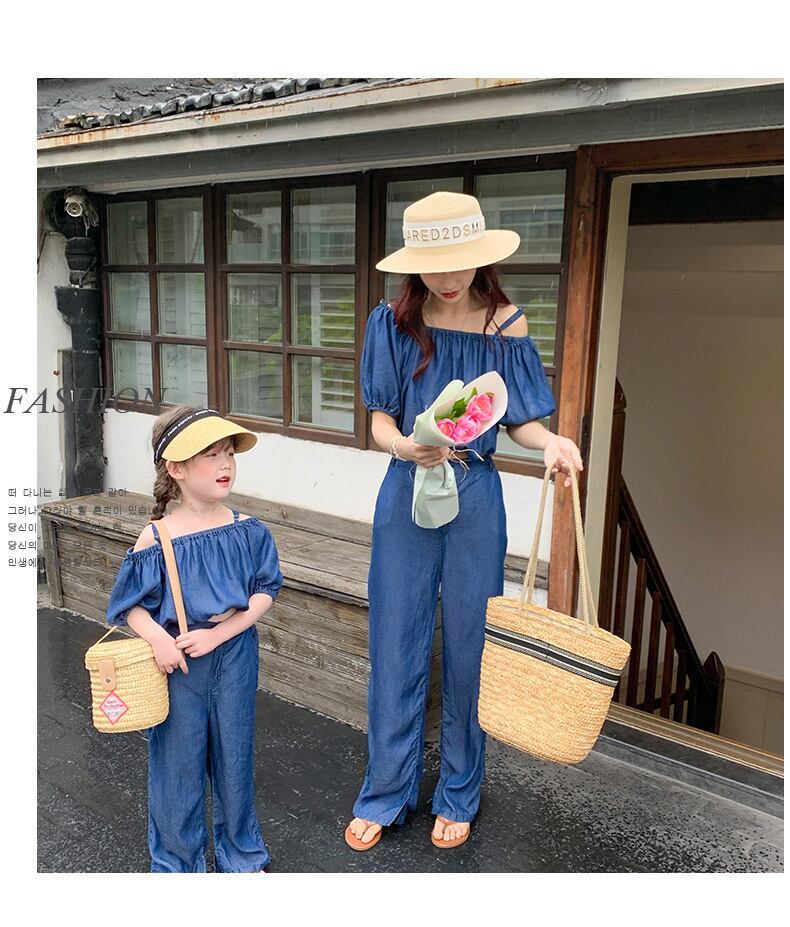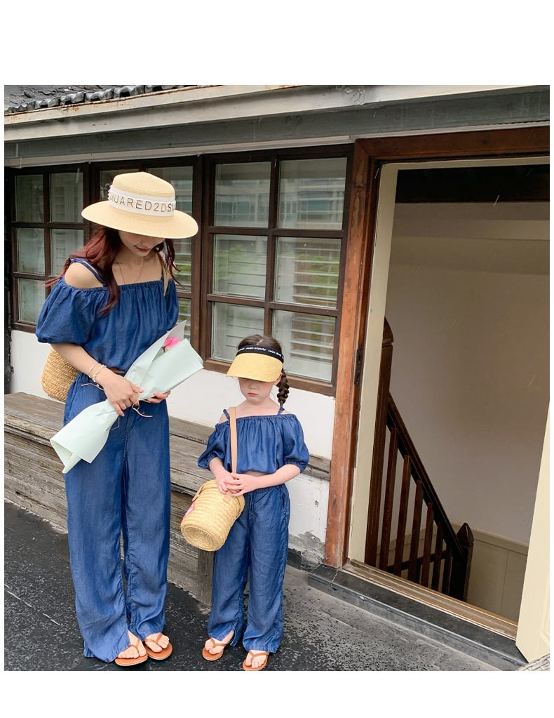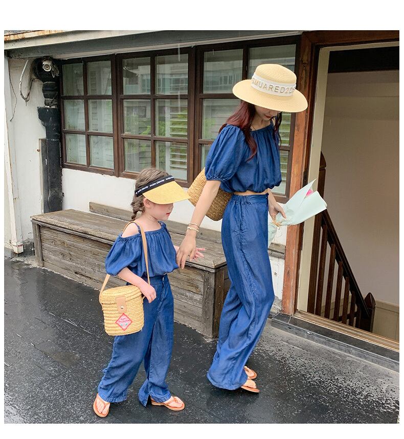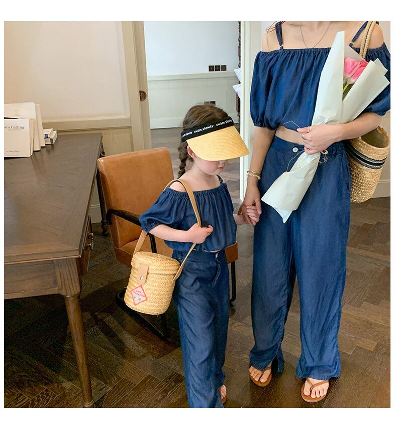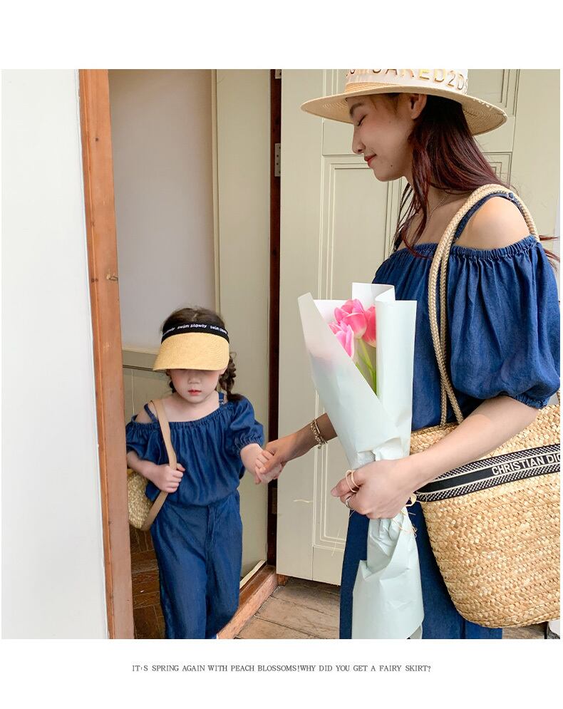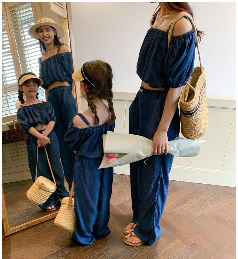 【送料無料】 セットアップ キッズ レディース 春 夏 青 ブルー ブラウス パンツ デニム 上下セット 子供 女の子 親子コーデ リンクコーデ ママ ママコーデ お揃い 双子 かわいい オフショルダー パフスリーブ おしゃれ 半袖 袖あり 90cm 100cm 110cm 120cm 130cm 140cm 150cm S M お出かけ 公園 旅行 リゾート 普段使い イベント 撮影 ラブリー ガーリー 子ども 服 コーデ 10代 20代 30代 カジュアル クール 個性的 ガール 韓国系 kd0247