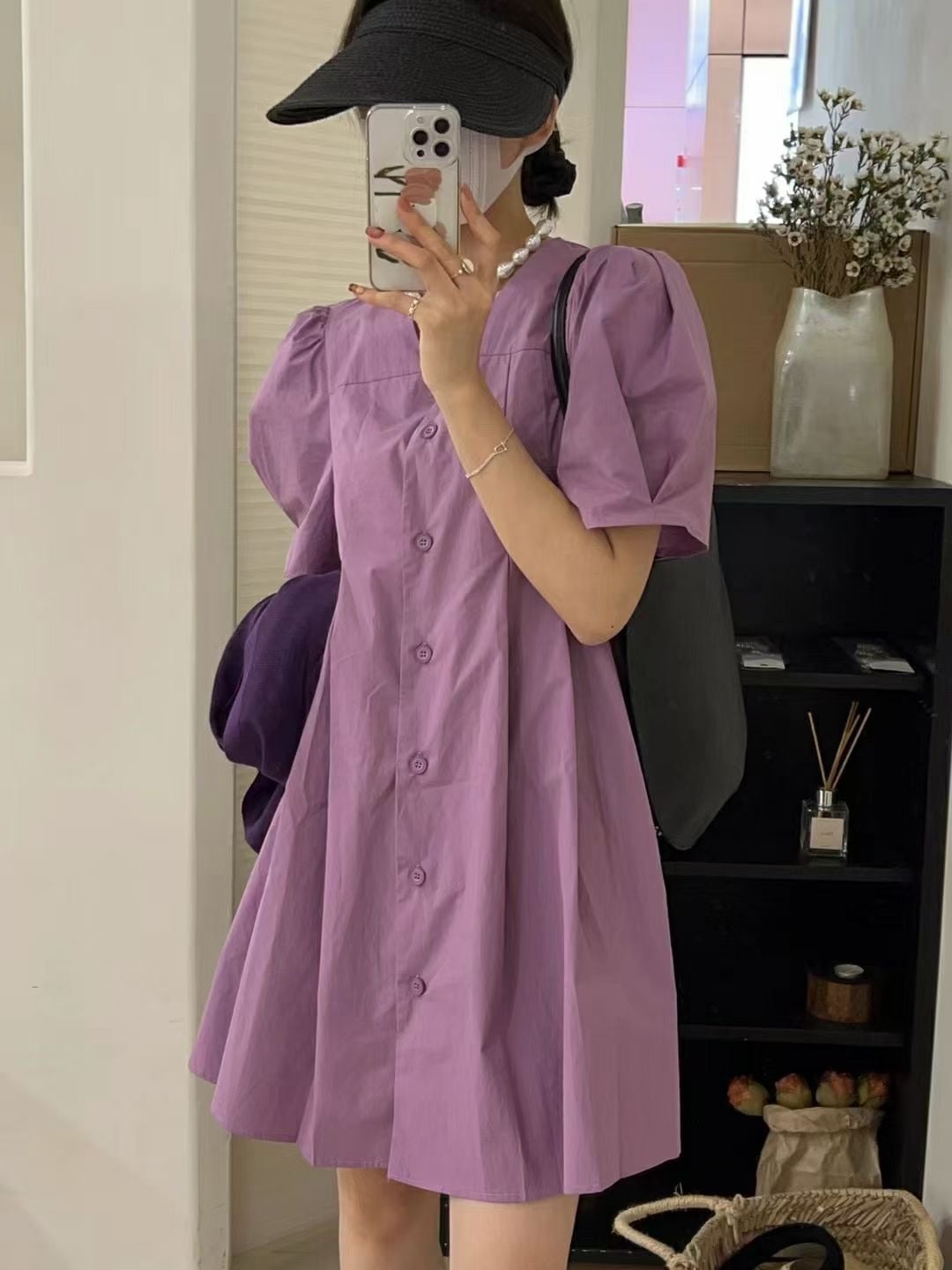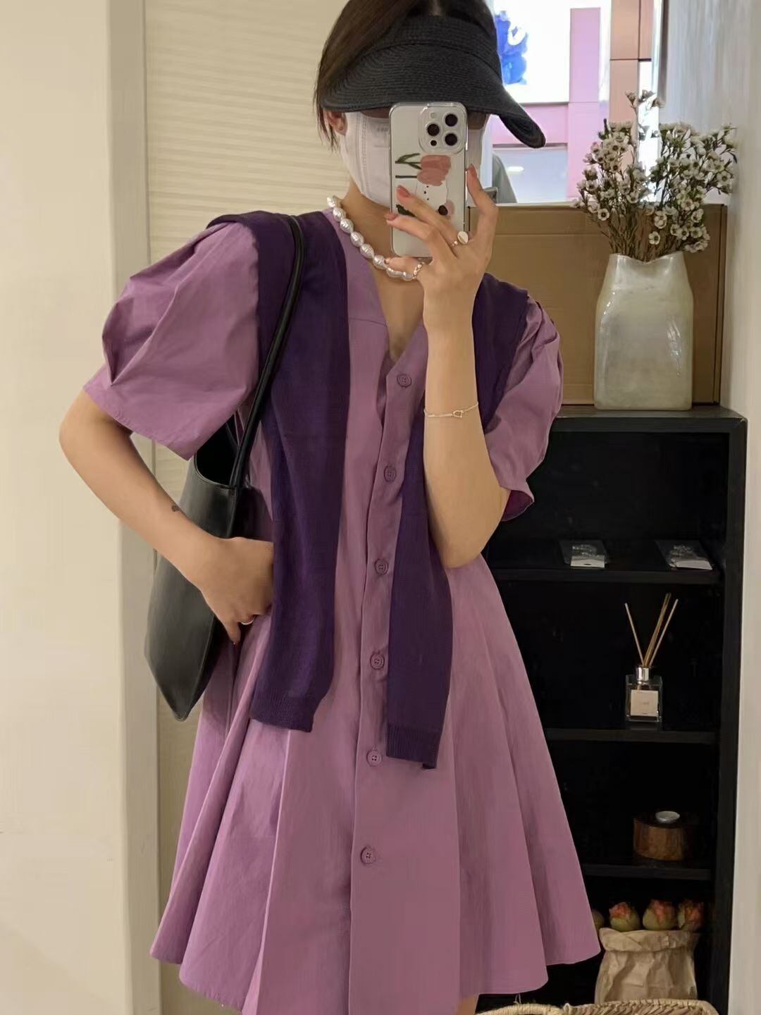 【送料無料】2色 ワンピ ワンピース シンプル ハイウエスト ショート ミニ ボタン 無地 パフスリーブ 半袖 Aライン ゆったり カワイイ レディース 脚長 着痩せ 着回し ワンサイズ フリーサイズ おしゃれ 春 夏 スプリング サマー ライトグリーン パープル 緑 紫 大人可愛い 普段使い デイリー使い 休日 お出かけ デート 女子会 存在感 主役級 こなれ感 韓国ファッション 海外トレンド インスタ映え 大人気 流行 10代 20代 30代 40代 プチプラ db3477