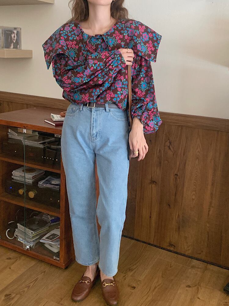 大きな襟とビビットな花柄が印象的なトップスです^^
