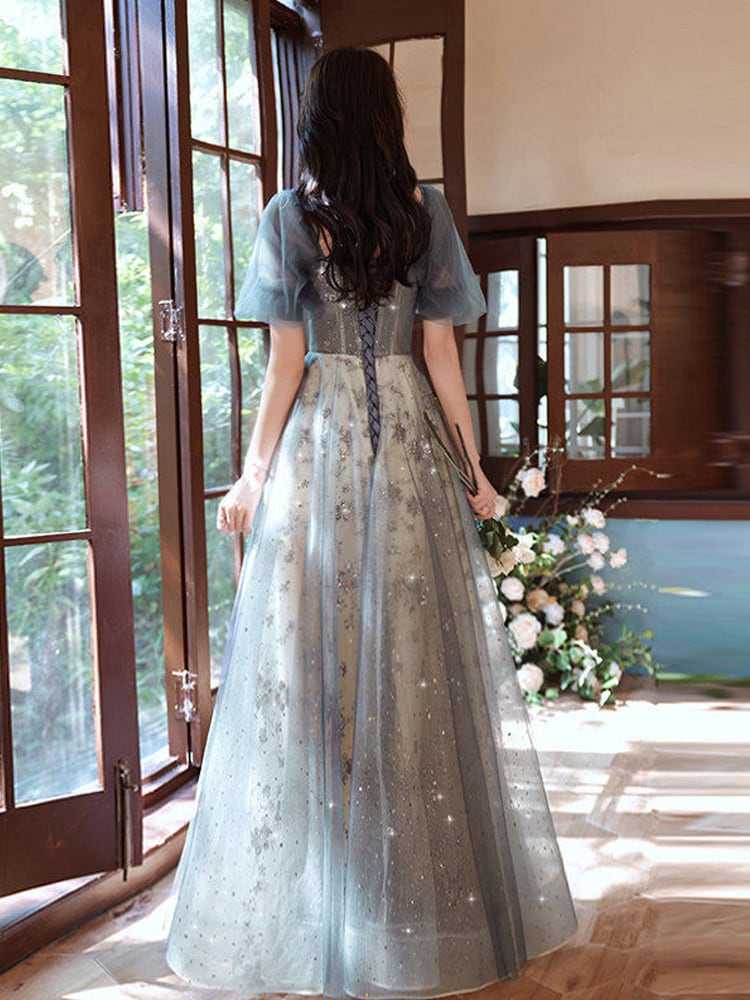 セクシーなデコルテデザインと繊細なグリッター装飾が綺麗なロングドレスです。