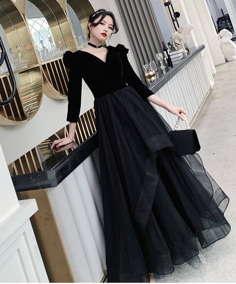 【送料無料】ロング ドレス パーティードレス Vネック 七分袖 フリル チュール 透け感 シンプル カッコイイ セクシー 結婚式 お呼ばれ 演奏会 発表会 フォーマル シック 二次会 きれいめ エレガント 華やか カワイイ レディース 脚長 着痩せ S M L XL 2XL 3XL 小さいサイズ 大きいサイズ おしゃれ 春 夏 秋 ブラック 黒 大人可愛い 存在感 主役級 こなれ感 韓国ファッション 海外トレンド インスタ映え 大人気 流行 10代 20代 30代 40代 no2370