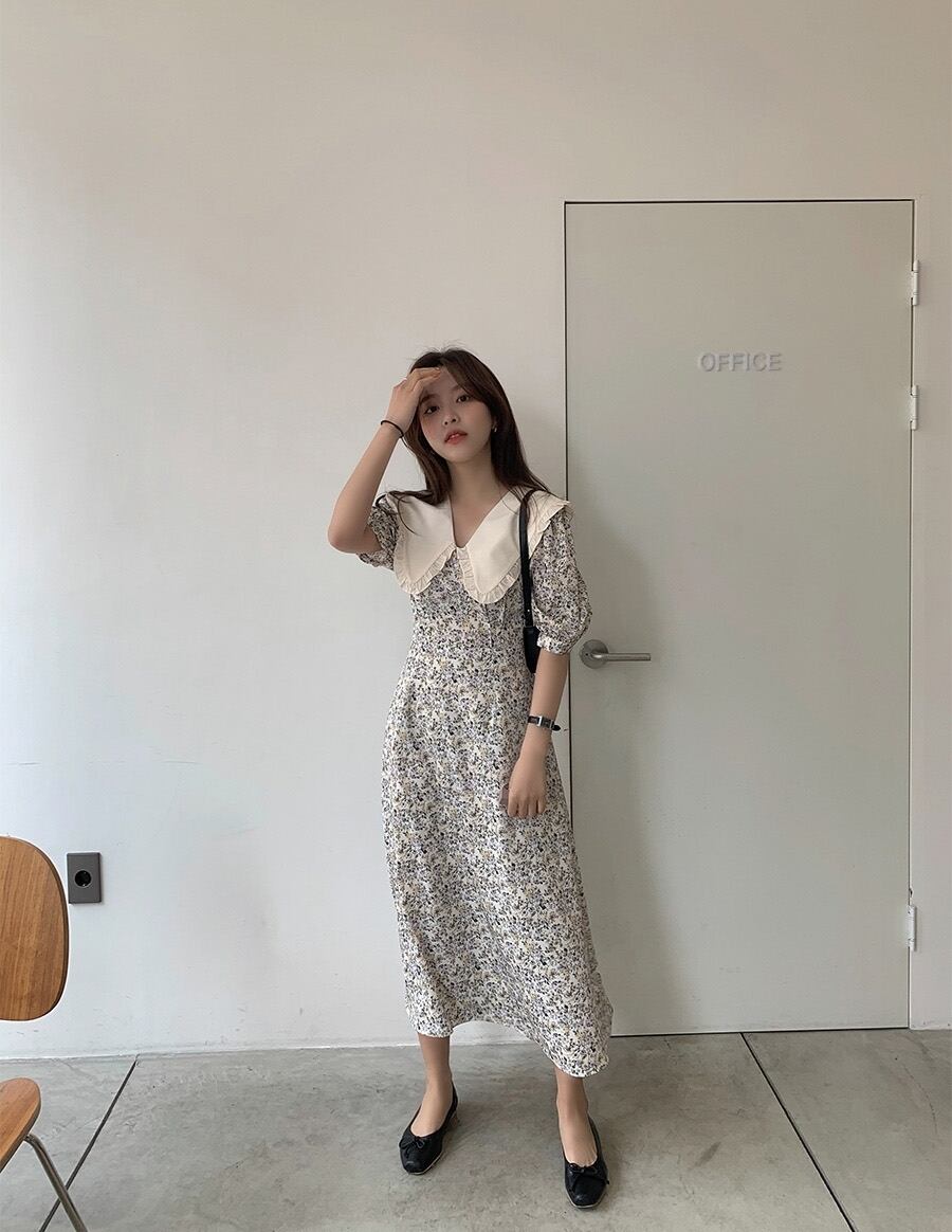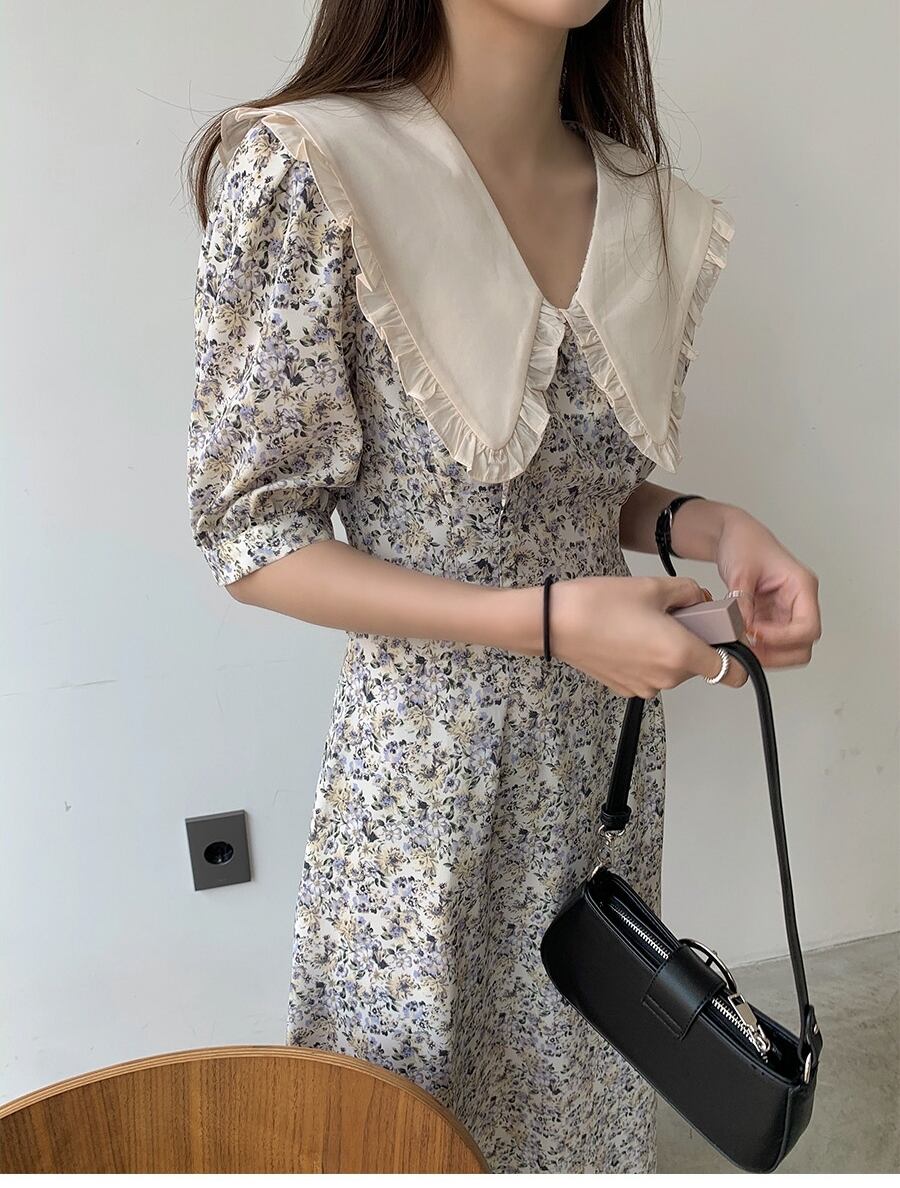 大きい襟が印象的な小花柄ワンピースです♪