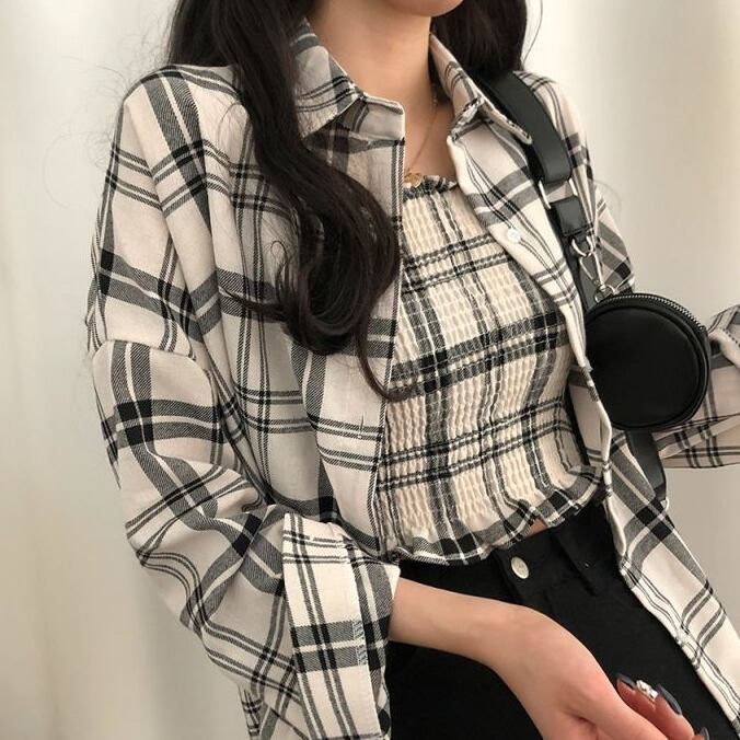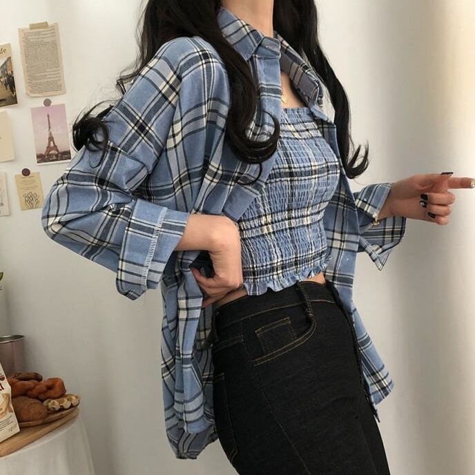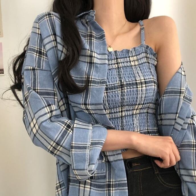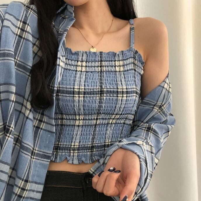 チェックシャツとクロップ丈キャミソールのセットアップ。