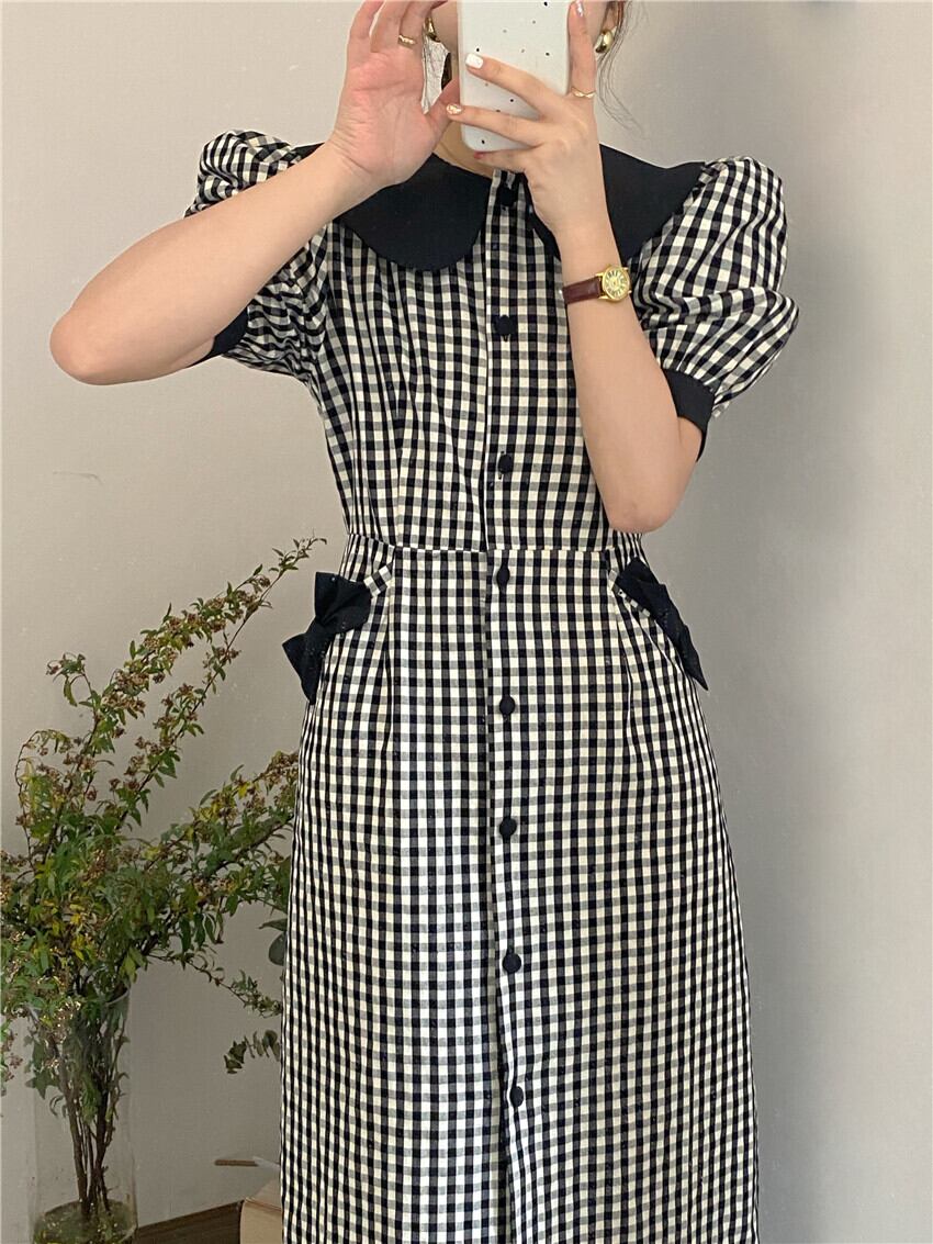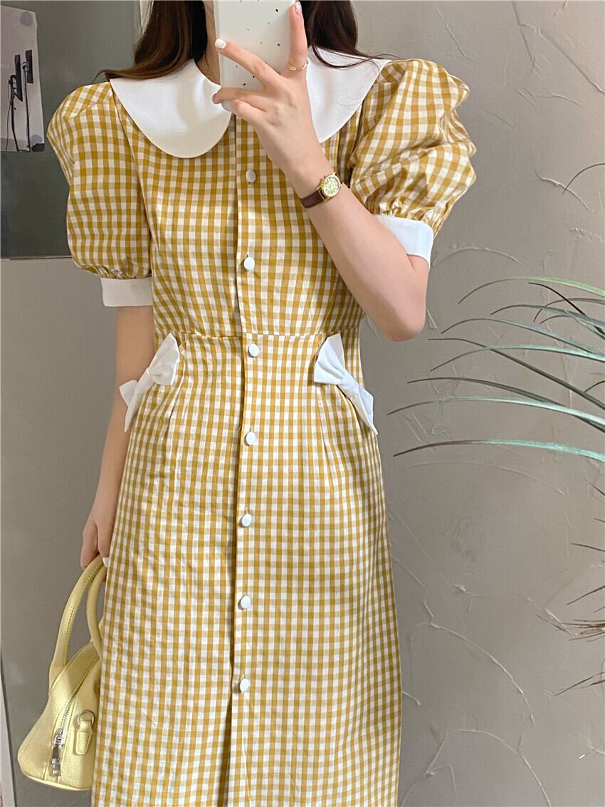 【送料無料】2色 ワンピース ビックカラー ラージカラー ブラック イエロー ミモレ丈 リボン ギンガムチェック パフスリーブ レトロ 可愛い 個性的 フレア ワンピース ドレス 襟付き 半袖 ガーリー ゆったり 華やか カワイイ プリティ 上品 大人女子 レディース バイカラー おしゃれ 春 夏 スプリング 大人可愛い モテコーデ デート 女子会 ボタニカル 柄 白 目立つ ユニーク ワンピドレス お出かけ こなれ感 韓国ファッション モデル パーティードレス 10代 20代 30代 db3471