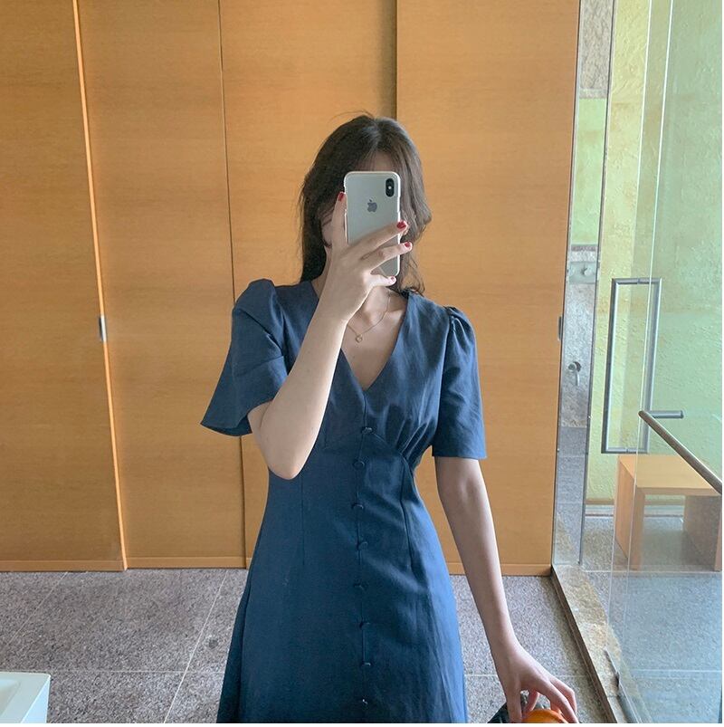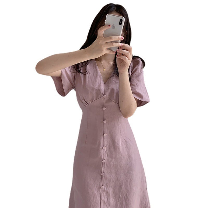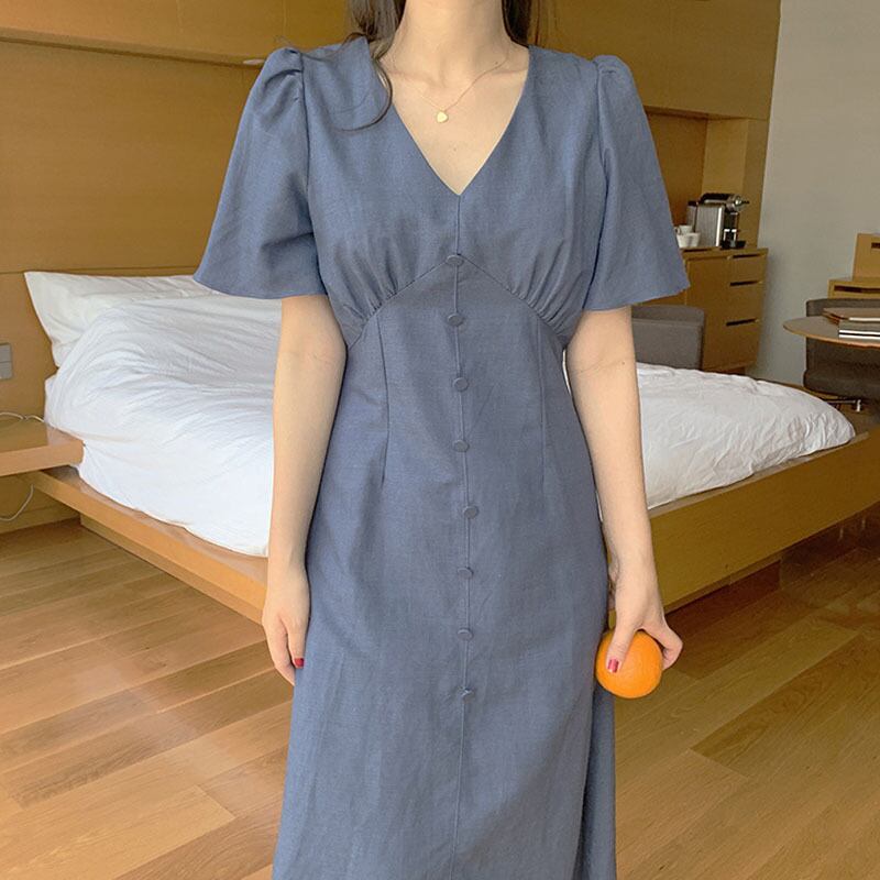 【送料無料】2色 フレアワンピース 無地 Vネック フェイクボタン ロング シンプル ミモレ丈 シック きれいめ クール カジュアル 学生 ゆったり お姉さん カワイイ レディース 着痩せ 着回し 脚長 S M L 大きいサイズ おしゃれ 夏 サマー ピンク ブルー 青 大人可愛い 普段使い デイリー使い 休日 お出かけ デート 女子会 存在感 主役級 こなれ感 韓国ファッション 海外トレンド インスタ映え 大人気 流行 10代 20代 30代 40代 プチプラ db3554